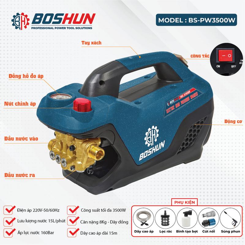 Thông số kỹ thuật Máy Rửa Xe Chỉnh Áp BOSHUN BS-PW3500W, Công Suất 3500W, Có Chỉnh Áp, Dây Xịt Dài 15M