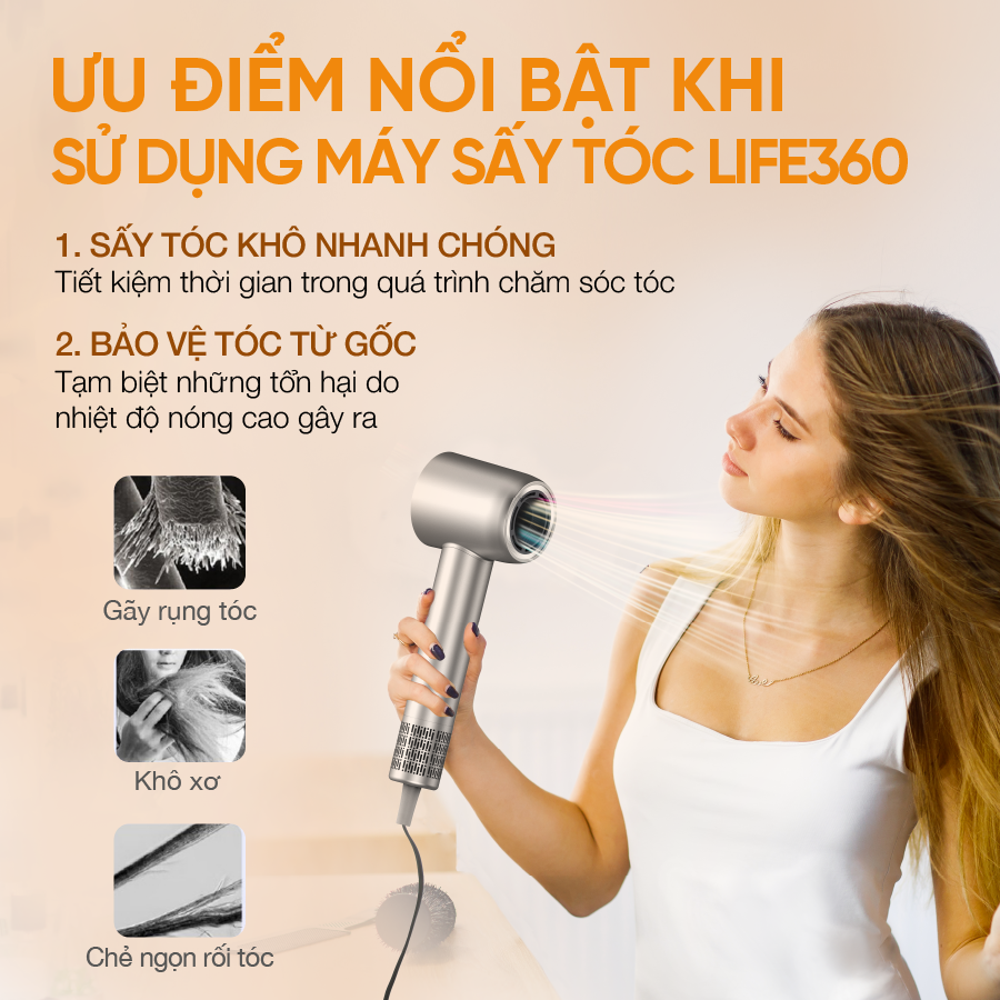 Máy sấy tóc ion âm tốc độ cao Life360 với 500 triệu ion âm làm giảm tích tụ tĩnh điện trong tóc, giữ cho mái tóc của bạn trở nên mềm mượt hơn như được chăm sóc tại salon. Công nghệ ion âm của máy sấy tóc Life360 thổi khí đều khắp da đầu, giúp dưỡng ẩm và mềm mượt hoàn toàn cho mái tóc của bạn nhằm giải quyết tốt các tình trạng tóc bị chẻ ngọn, thắt nút và khô xơ.