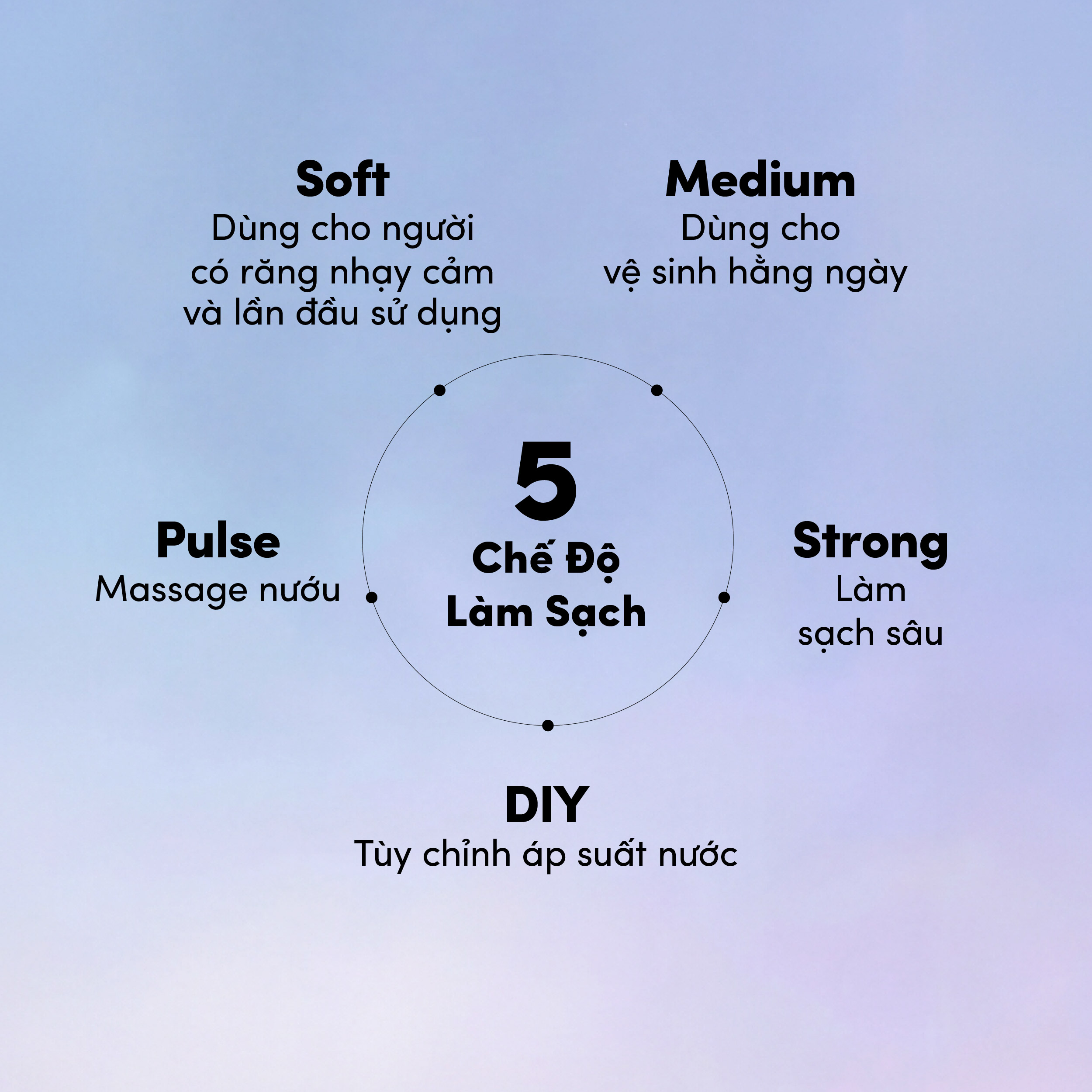> Màn hình OLED cùng 5 chế độ làm sạch, đáp ứng mọi nhu cầu của bạn. Đặc biệt chế độ DIY cho phép tuỳ chỉnh áp lực nước theo nhu cầu của riêng bạn, rất phù hợp cho các bạn có tình trạng răng miệng nhạy cảm.