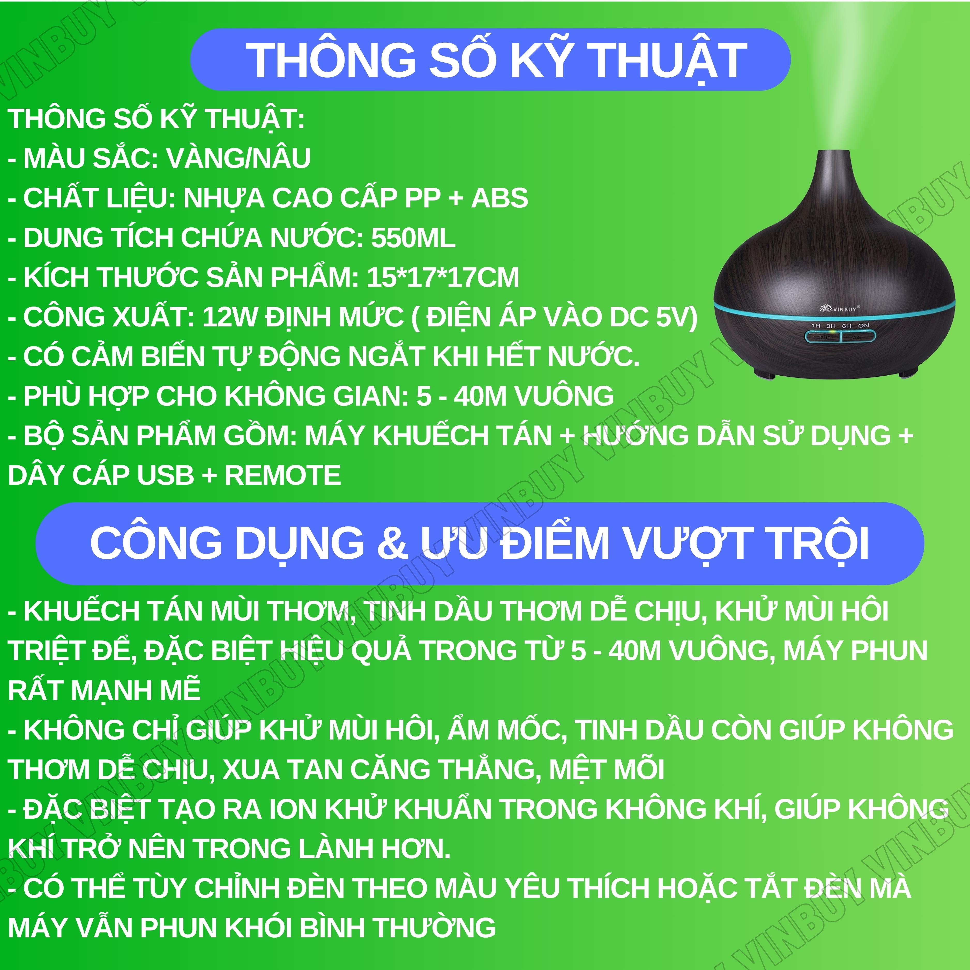 Thông số kỹ thuật Máy phun sương tạo độ ẩm không khí dung tích lớn 550ml - cấp ẩm cho da, phòng điều hòa, khuếch tán tinh dầu - Chĩnh Hãng - VinBuy