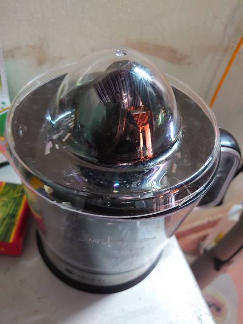 Máy vắt cam dùng điện 220V, có 2 đầu vắt đi kèm để phù hợp với kích thước quả cần vắt: Cam, quýt và chanh.