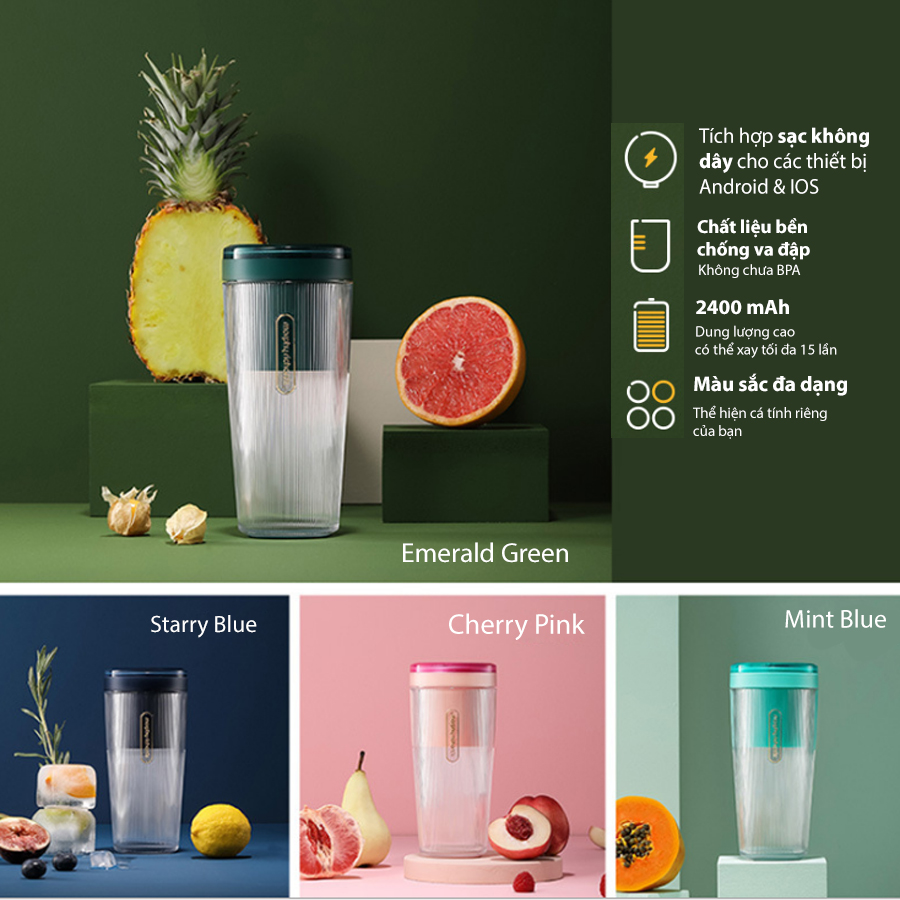- Máy xay sinh tố nhỏ gọn tiện dụng mang đi bất cứ nơi đâu: xe máy, xe hơi, phòng Gym, văn phòng, trường học, chạy bộ công viê