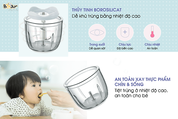 Cối xay được làm bằng thủy tinh borosilicate trong suốt, chịu lực và chịu nhiệt cao. Trong quá trình sử dụng có thể xay được đồ ăn chín, nóng hoặc tiệt trùng bằng nhiệt an toàn.
