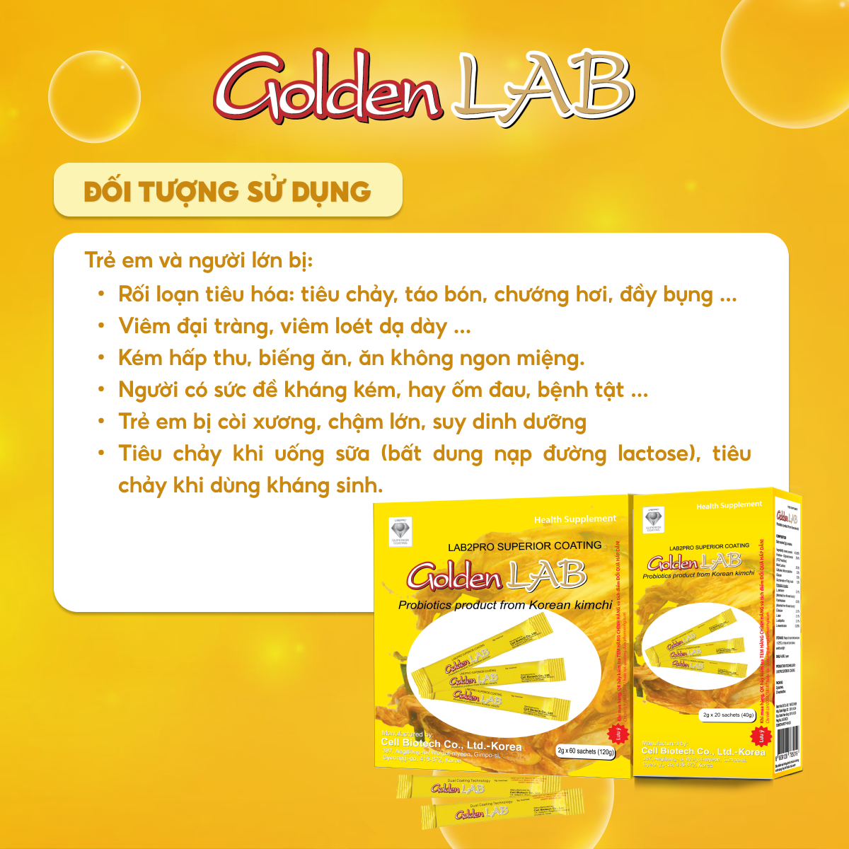 Thông số kỹ thuật Men vi sinh Golden Lab - Nhập khẩu từ Hàn Quốc Hộp 20 gói - 60 gói