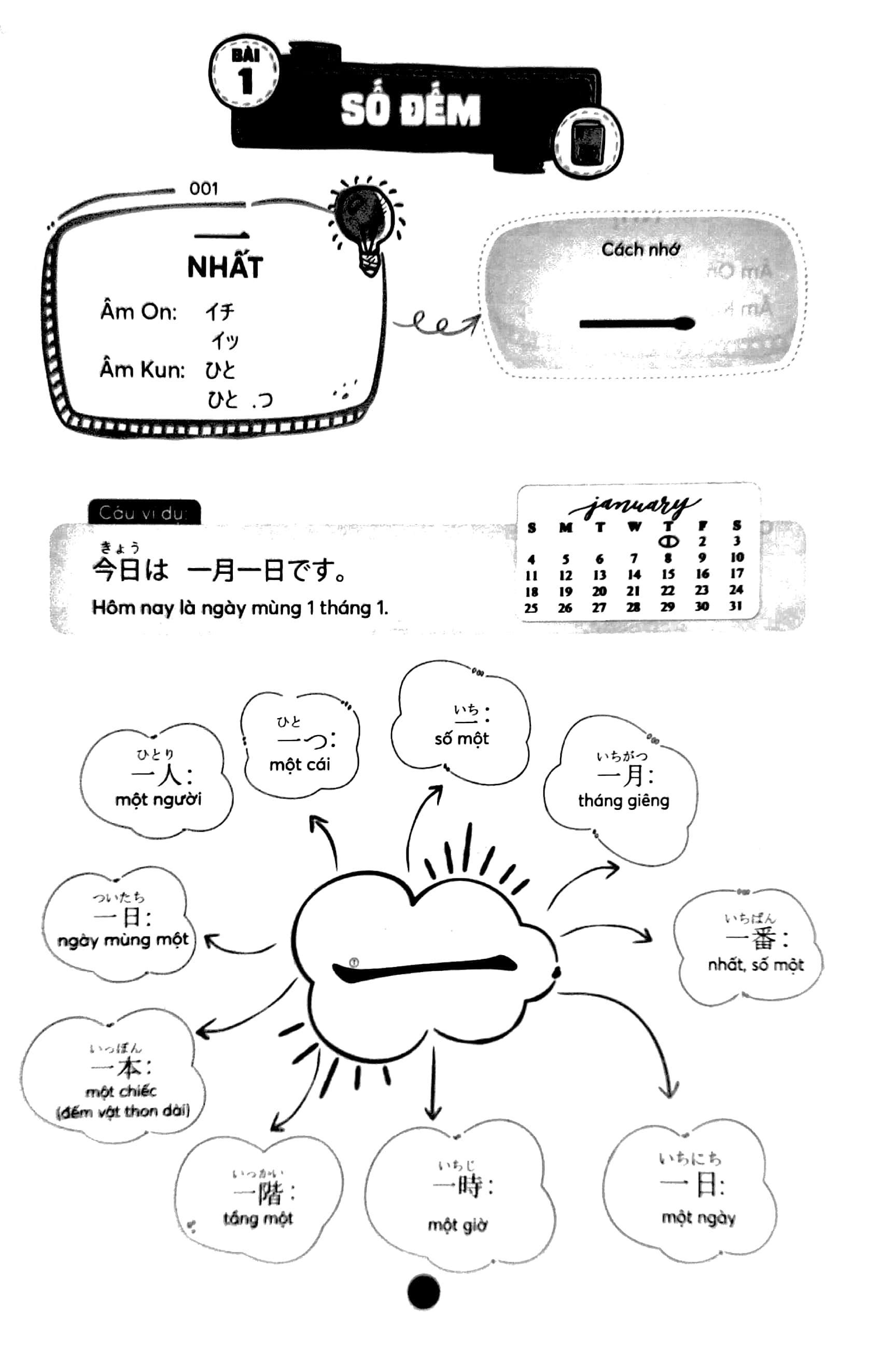 Kết hợp phương pháp mindmap và học 1 biết 10, mỗi chữ Hán được cung cấp đầy đủ thông tin: cách đọc (âm On và âm Kun), âm Hán Việt, thứ tự nét viết, cách nhớ chữ Hán, câu ví dụ và các từ vựng tiêu biểu.
