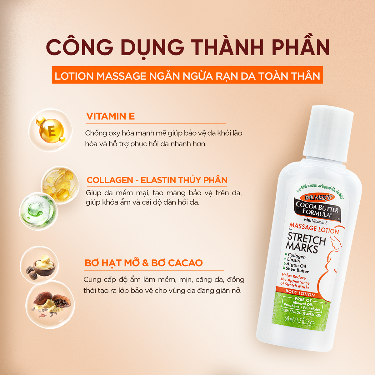 Palmer's Cocoa Butter Formula Massage Lotion hỗ trợ cải thiện độ đàn hồi của da và cải thiện vẻ ngoài của các vùng da có dấu hiệu rạn. Thành phần chứa Bơ cacao nguyên chất, Bơ hạt mỡ, Dầu thiên nhiên, Collagen, Elastin và Lutein, giúp duy trì độ ẩm và sự mềm mại cho làn da trong nhiều giờ, từ đó hỗ trợ làn da dễ thích nghi hơn trong giai đoạn thay đổi.