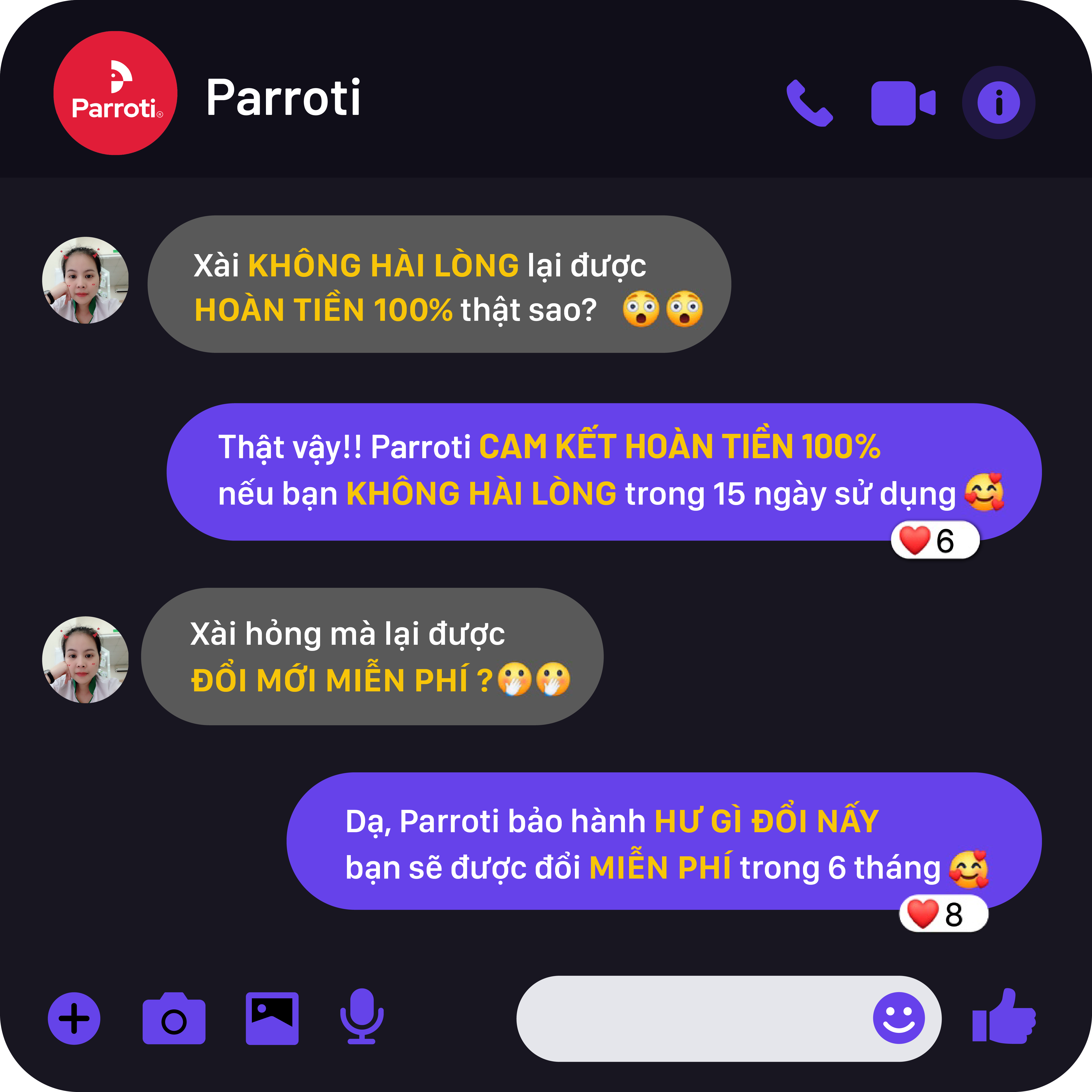 Parroti xin cảm ơn quý khách hàng đã tin tưởng sử dụng và đánh giá 5 sao cho sản phẩm. Parroti luôn cam kết về chất lượng sản phẩm và dịch vụ. Với chính sách bảo hành 6 tháng HƯ GÌ ĐỔI NẤY và Hoàn 100% giá trị sản phẩm trong 7 ngày sử dụng (tính từ ngày nhận hàng thành công) nếu KHÔNG HÀI LÒNG. *** *** luôn sẵn sàng để được hỗ trợ 24/7. Parroti xin cảm ơn và chúc quý khách hàng thật nhiều sức khỏe, niềm vui!