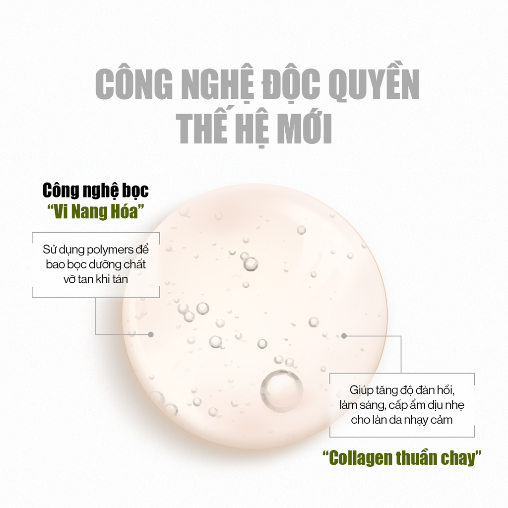 Hiệu ứng da glow khỏe, không nhờn rít: Chứa viên nang collagen thuần chay dưỡng da, vỡ tan khi tán để giải phóng lớp tinh chất cấp ẩm. Kết cấu thông minh giúp da glowy, mềm mại nhưng vẫn thoáng nhẹ, không bết rít, không bí tắc