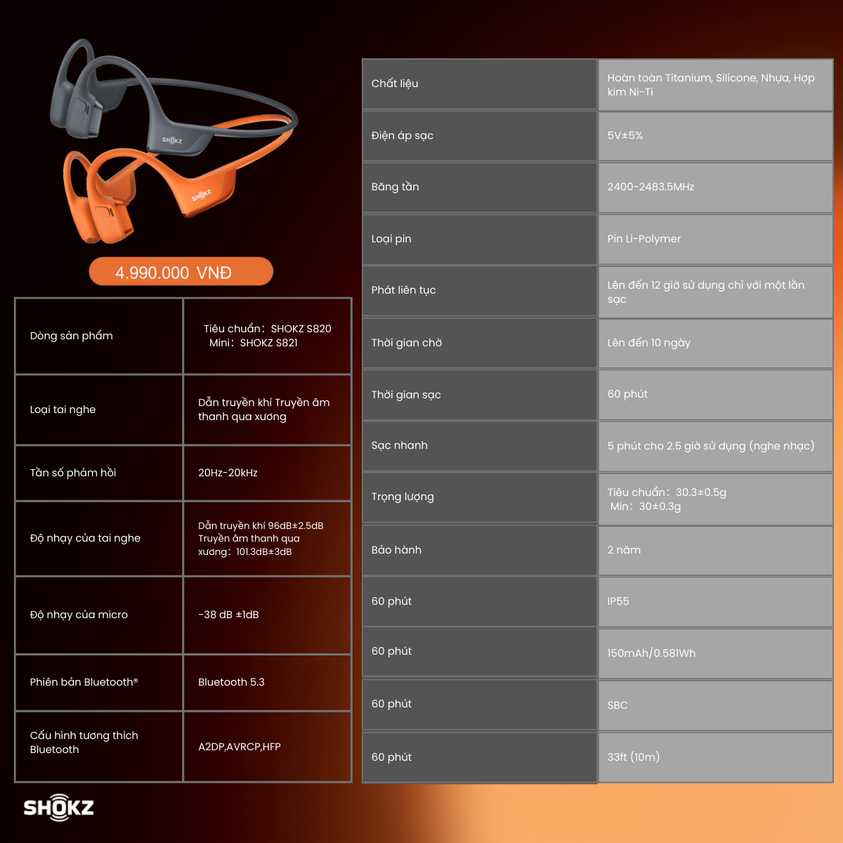 Thông số kỹ thuật [MỚI] Tai Nghe Bluetooth Thể Thao Truyền Âm Thanh Qua Xương SHOKZ OPENRUN PRO 2 S820 - Bảo Hành 2 Năm - Hàng Chính Hãng
