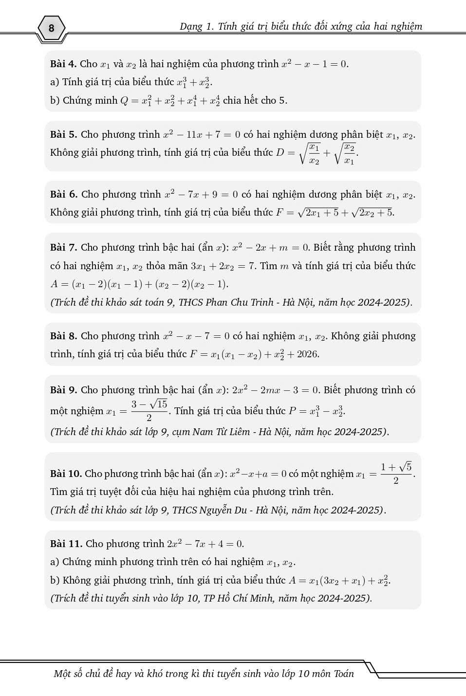 Bao quát được một số dạng toán khó thi ts 10, do giới hạn số lượng trang nên lượng bt vừa đủ, ít bình luận tương tác với độc giả nhưng với đối tượng hướng tới là hs chỉ cần đáp số nhanh, và làm lại được thì ok r.