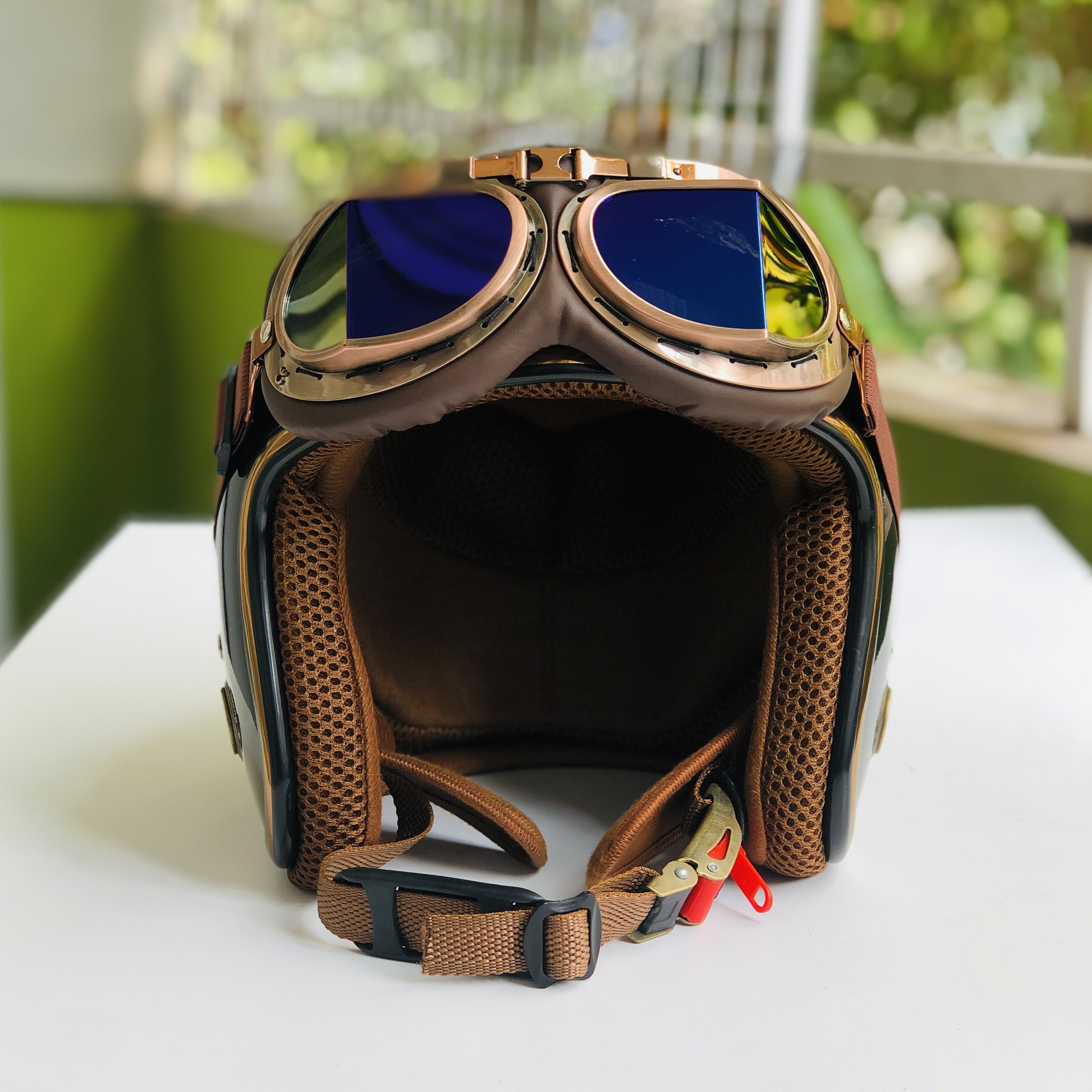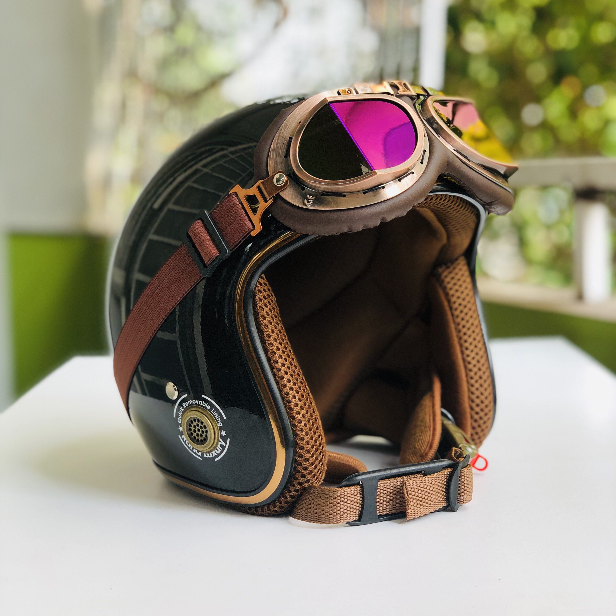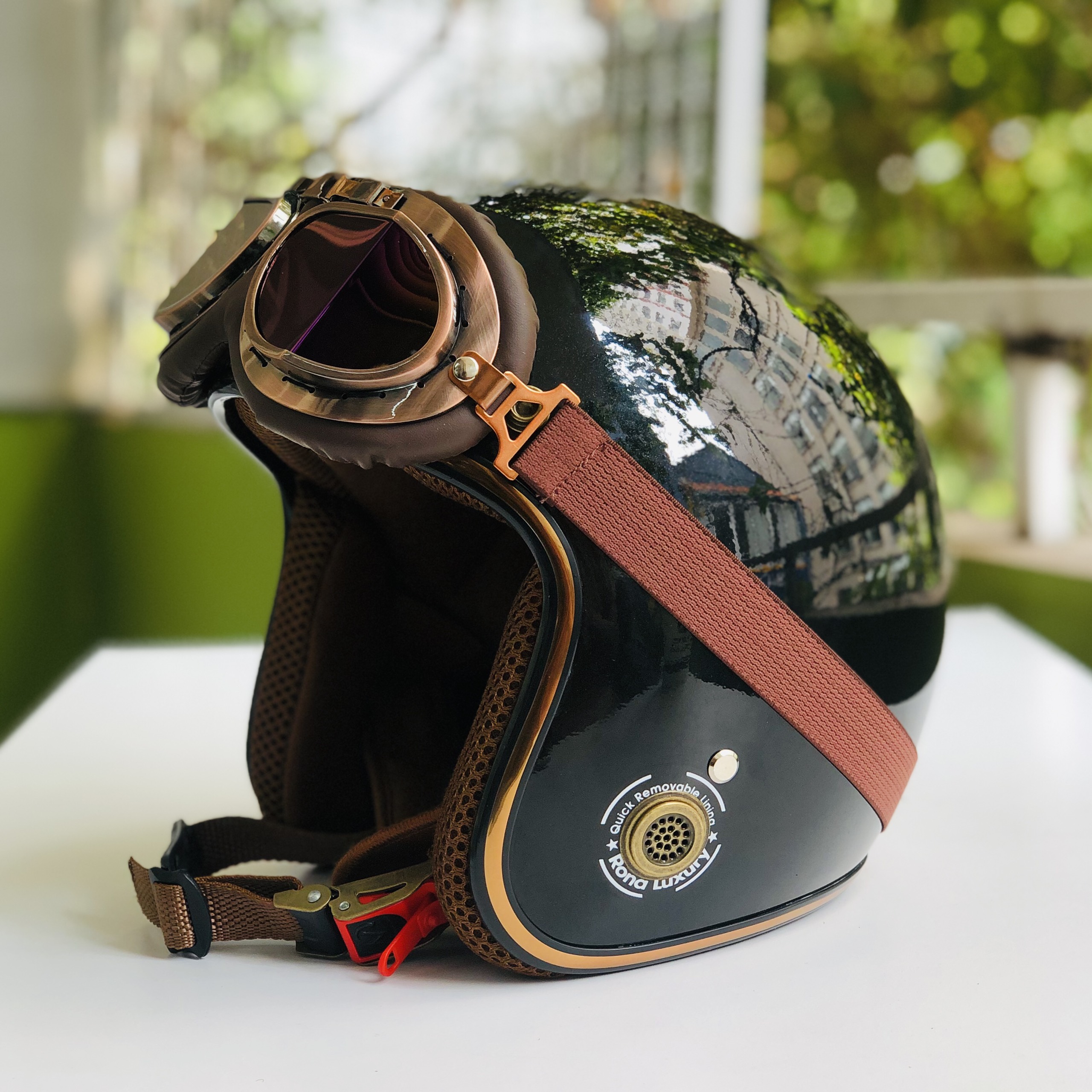 - Mũ bảo hiểm 3/4 RONA kèm kính phi công viền đồng được làm bằng nhựa ABS nguyên sinh chống va đập khá tốt, giúp giảm thiểu rủi ro khi có tai nan xảy ra.