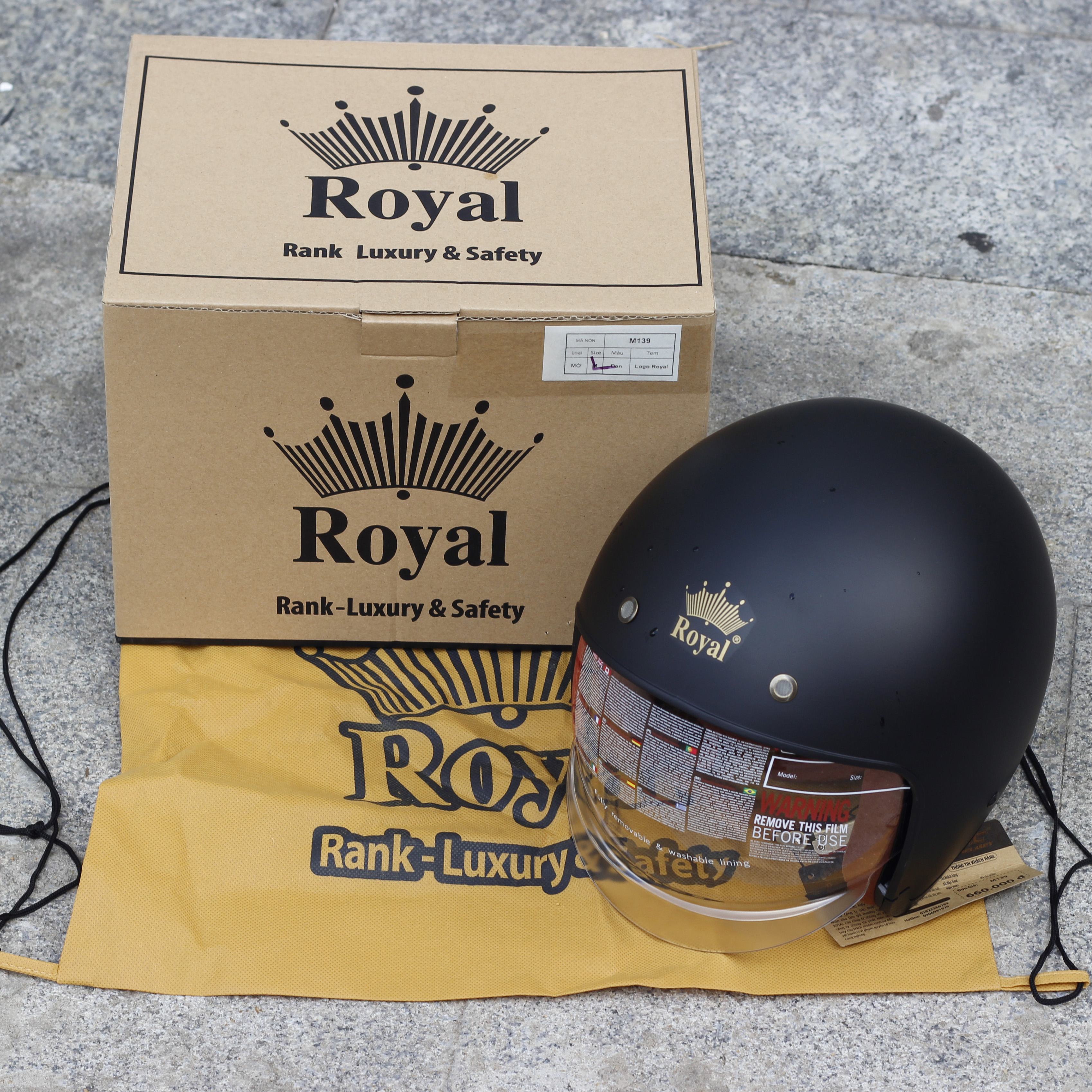 - Nón Royal M139 được tặng kèm 1 túi rút cao cấp. Nón được đựng trong thùng nón.