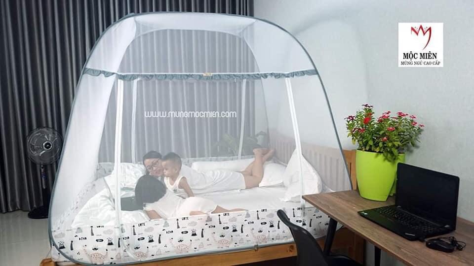 Không gian sinh hoạt vui chơi cho bé và bố mẹ: Để con nhỏ chơi trong mùng chụp này, bố mẹ không phải lo lắng ngoài vấn đề MUỖI CẮN, mà còn giúp TRÁNH con BỊ TÉ khỏi giường. Mùng ôm sát nệm,có 4 dây chun cài rất chắn chắn