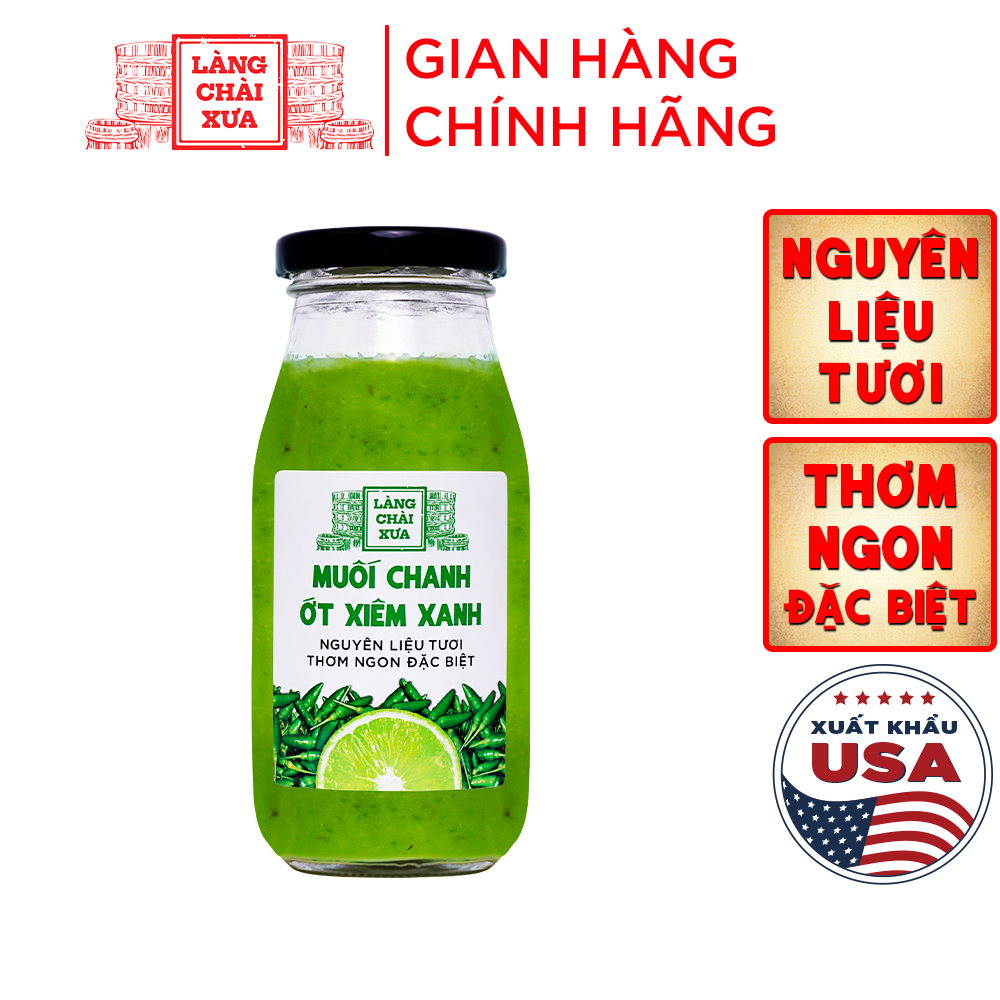 Muối chanh ớt xiêm xanh Làng Chài Xưa rất thơm ngon và khác biệt, được làm công phu bằng nguyên liệu tươi. Chanh tươi, ớt xiêm tươi và muối sạch tinh khiết hòa quyện nồng nàn giúp món ăn ngon hơn rất nhiều, đặc biệt là hải sản hấp, nướng.