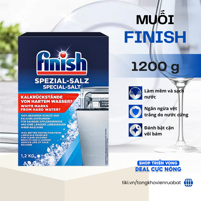 - Muối rửa chén bát Finish Salt ngăn chặn các tạp khoáng trong nước, không cho bám dính kết tủa trong máy rửa bát, các ion Ca+, Mg+ trong nước dùng cho máy rửa bát có thể nhanh chóng làm giảm sức mạnh của máy rửa bát như làm giảm tính năng xà phòng rửa bát, giảm tính năng độ phun của vòi đặc biệt là các mảng bám làm bát đĩa xấu đi.