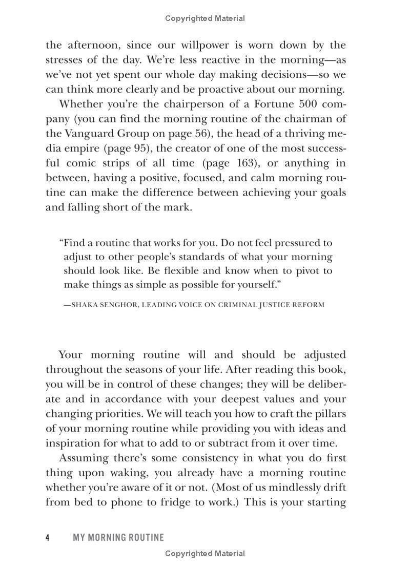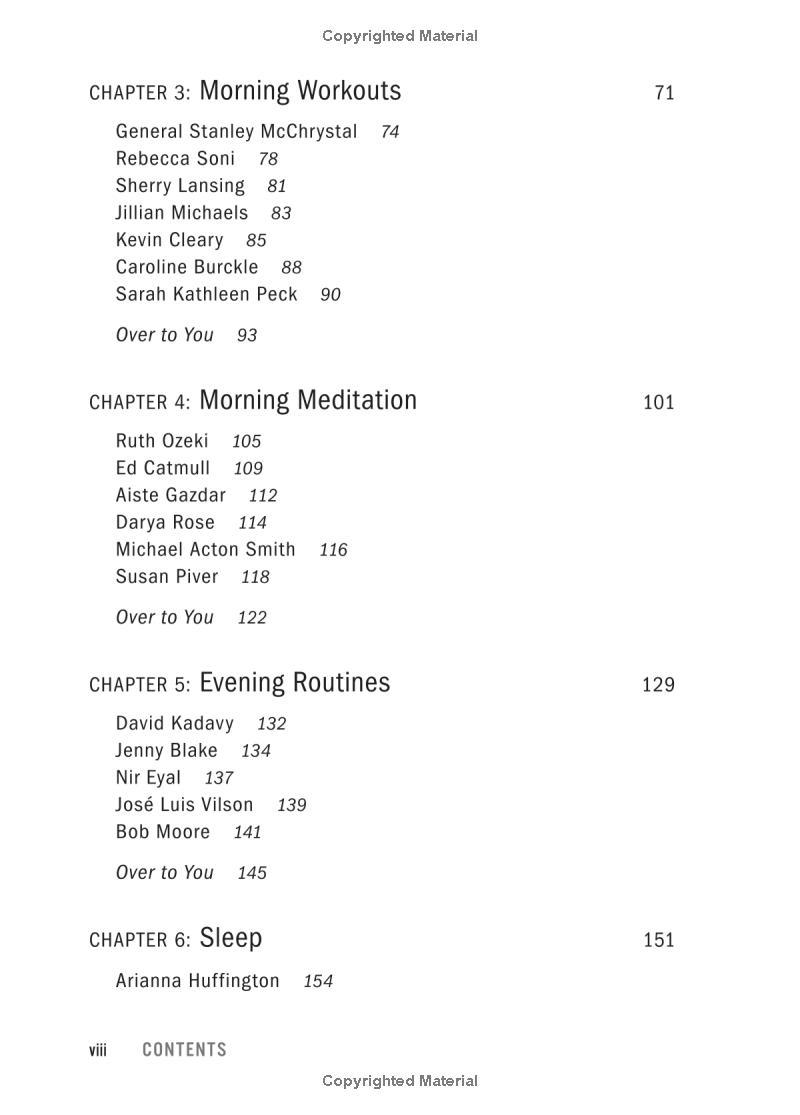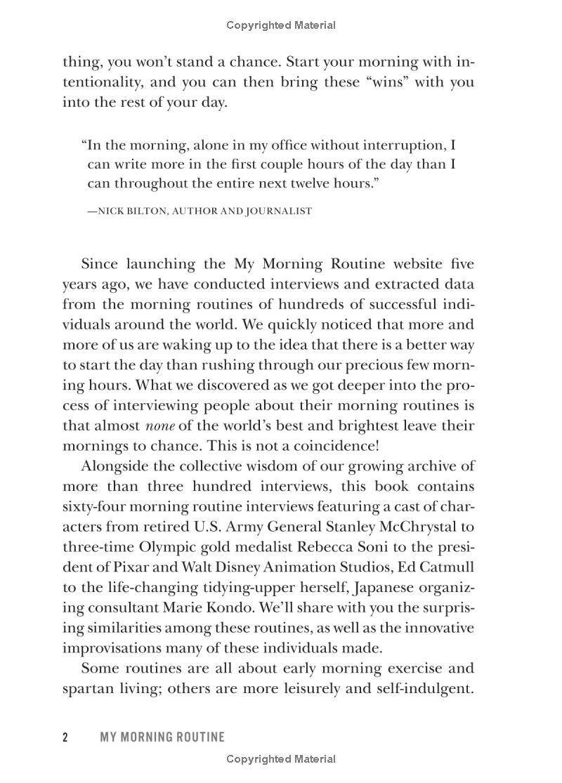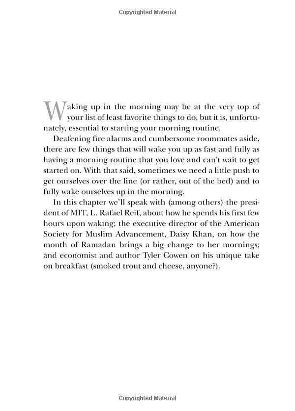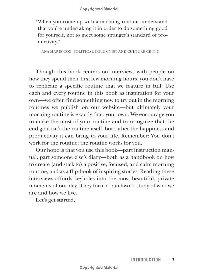 Some routines are all about early-morning exercise and spartan living; others are more leisurely and self-indulgent. Whether you want to boost your productivity, implement a workout or meditation routine, or learn to roll with the punches in the morning, this book has you covered.