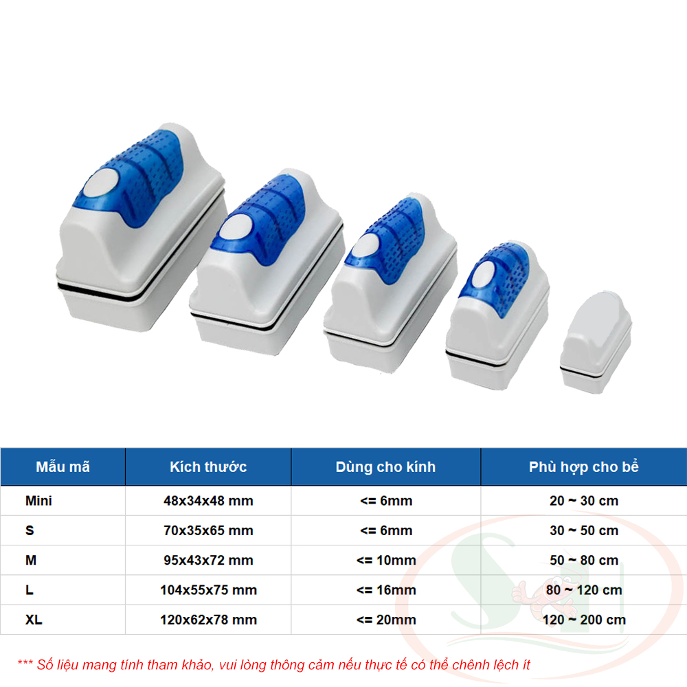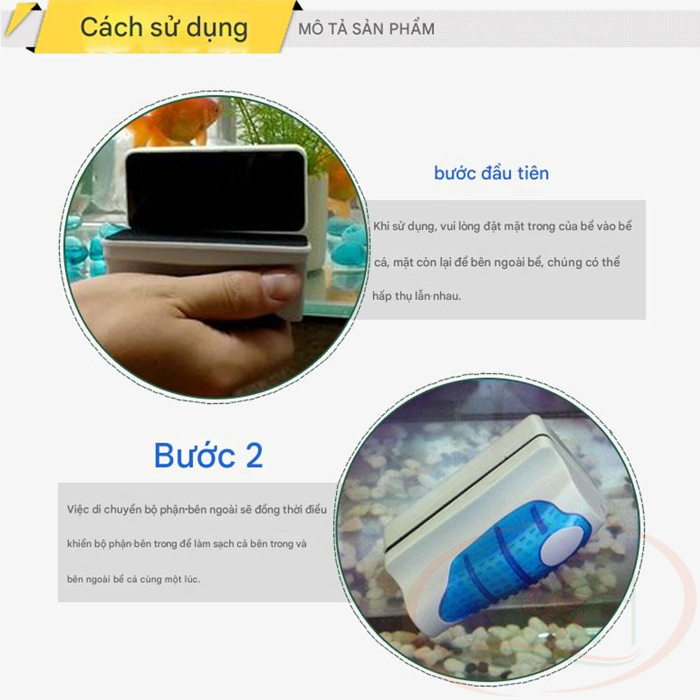 * Tránh để cát hoặc vật cứng mắc kẹt giữa hai phần nam châm, khi thao tác cọ bể có khả năng làm xước kính hoặc acrylic.
