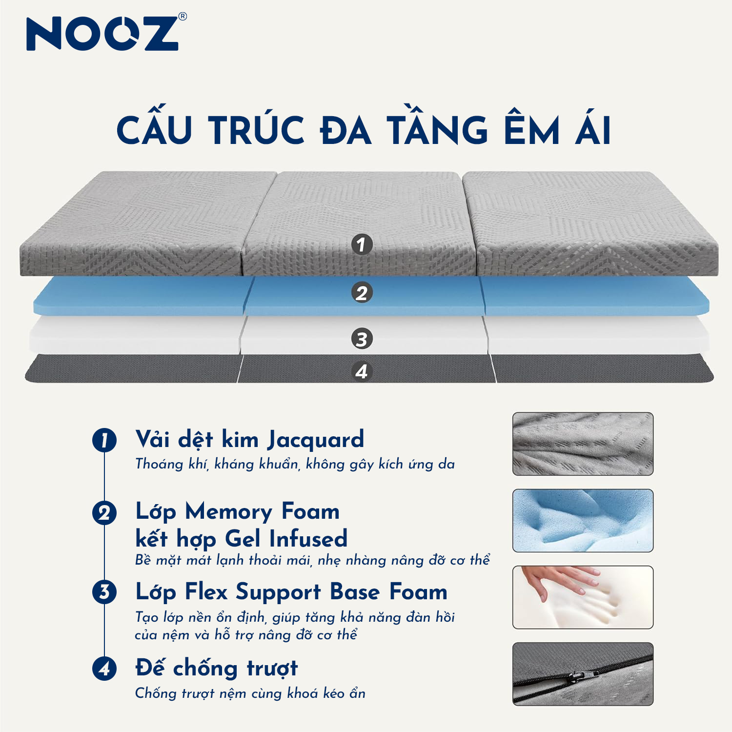 - Sản phẩm nệm gấp ba bao gồm: Vải dệt kim Jacquard, lớp Memory Foam kết hợp Gel Infused, lớp Flex Support Base Foam, đế chống trượt