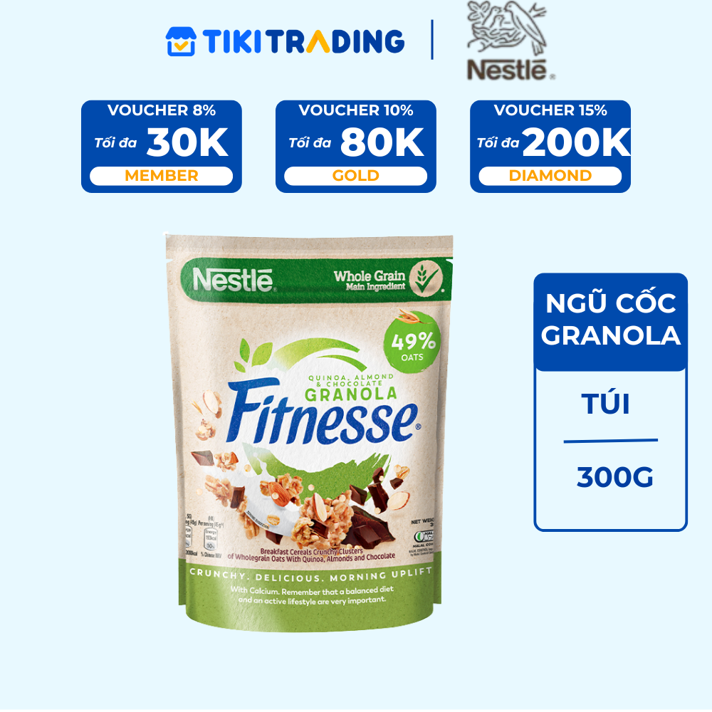 Thông số kỹ thuật Ngũ cốc ăn sáng Fitnesse Granola Diêm Mạch, Hạnh Nhân & Sô Cô La (gói 300g)