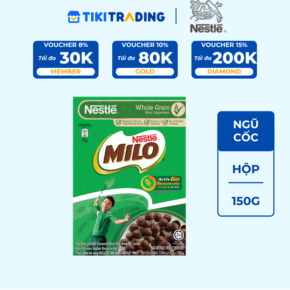 - Ngũ cốc ăn sáng Nestlé MILO vị ca cao lúa mạch, hình viên, là sản phẩm ngũ cốc ăn liền, dùng kèm với sữa cho bữa sáng giàu dinh dưỡng với thành phần chủ yếu từ ngũ cốc nguyên cám cung cấp 5 vitamin nhóm B, canxi, chất xơ và chất sắt giúp bé có thêm năng lượng để hăng say học tốt mỗi ngày và tăng cường hệ miễn dịch.