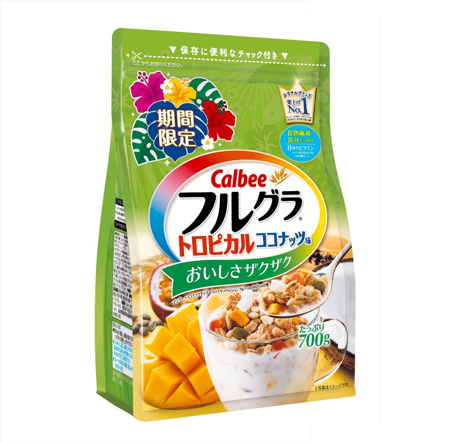 4. 4. Ngũ cốc màu xanh thành phần gồm: Xoài, chanh dây, dừa, đu đủ, hạt bí đỏ, yến mạch, lúa mạch, ..