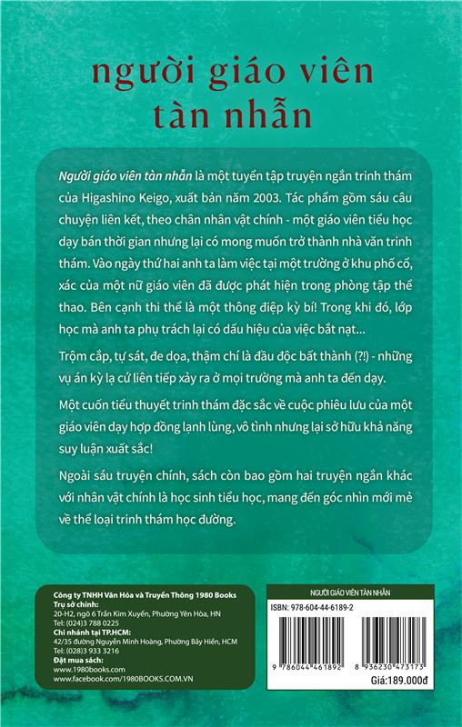 Nội dung chính:Người giáo viên tàn nhẫn là một tuyển tập truyện ngắn trinh thám của Higashino Keigo, xuất bản năm 2003. Tác phẩm gồm sáu câu chuyện liên kết, theo chân nhân vật chính - một giáo viên tiểu học dạy bán thời gian nhưng lại có mong muốn trở thành nhà văn trinh thám. Vào ngày thứ hai anh ta làm việc tại một trường ở khu phố cổ, xác của một nữ giáo viên đã được phát hiện trong phòng tập thể thao. Bên cạnh thi thể là một thông điệp kỳ bí! Trong khi đó, lớp học mà anh ta phụ trách lại có dấu hiệu của việc bắt nạt...