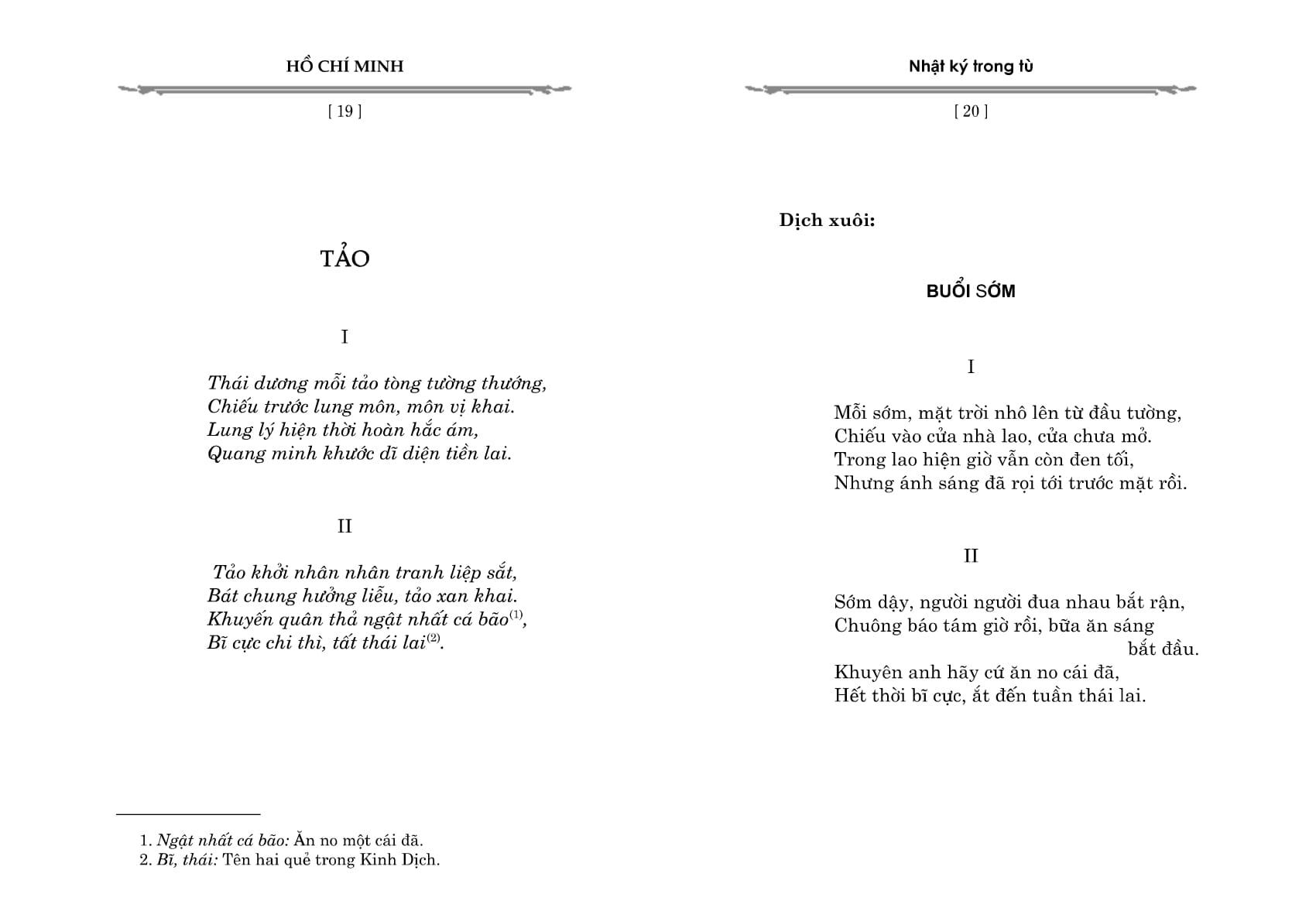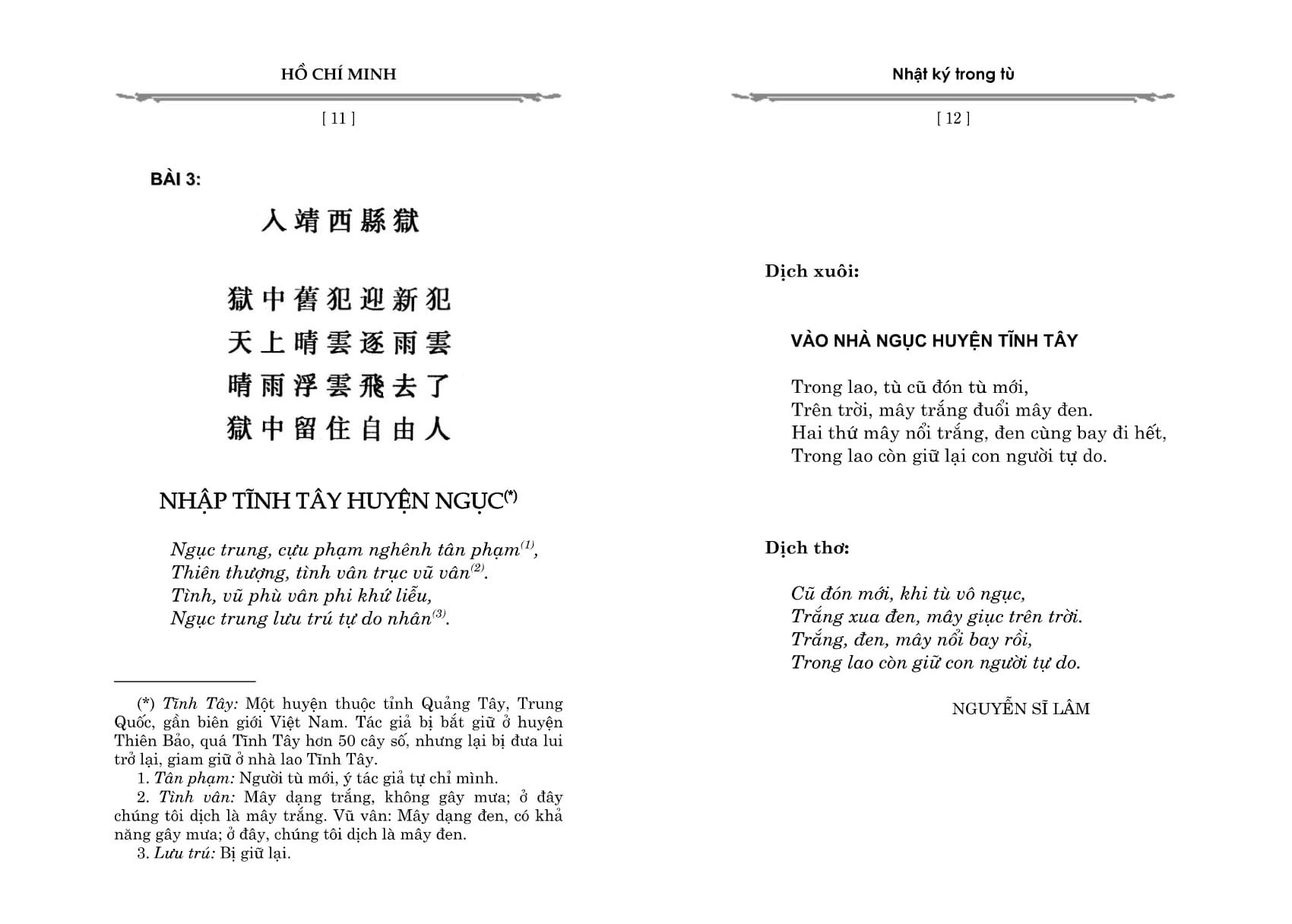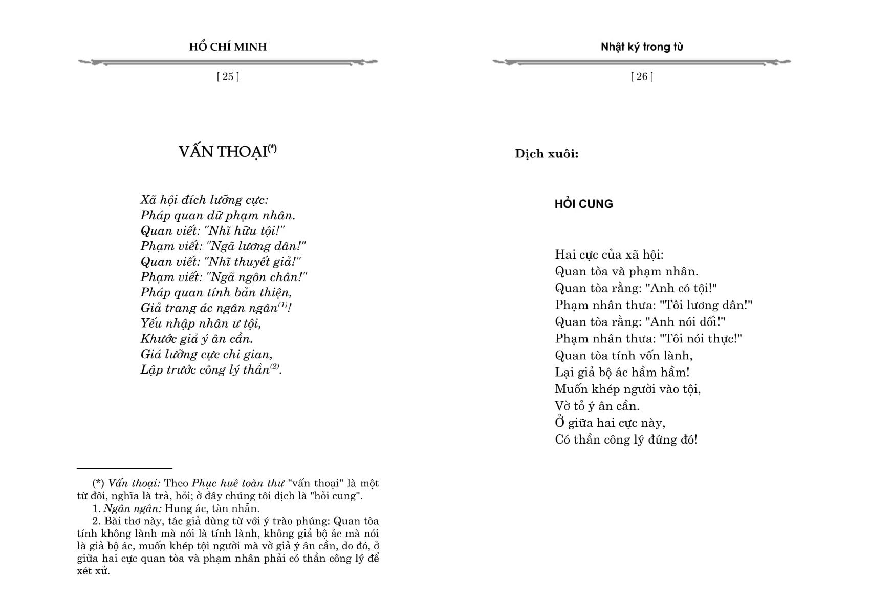 “Ngôn từ của Bác không phải là ngôn từ cổ điển. Thể loại thơ của Bác cũng 4 câu nhưng nó là tứ tuyệt tự sự - ghi nhật kí, kể chuyện. Đó là điều rất khác thơ Đường. Thơ Đường hay so sánh, đối thanh, đối ý nhưng thơ của Bác không chủ về đối. Những việc làm của Bác rất nhỏ nhưng có nhiều việc nhỏ của Bác cũng có ý nghĩa lớn. Điều đó khẳng định Bác của chúng ta rất trân trọng, yêu quý văn hóa Trung Quốc và ra sức học tập nó nhưng không bao giờ rập khuôn.” - Giáo sư Phương Lựu phân tích.