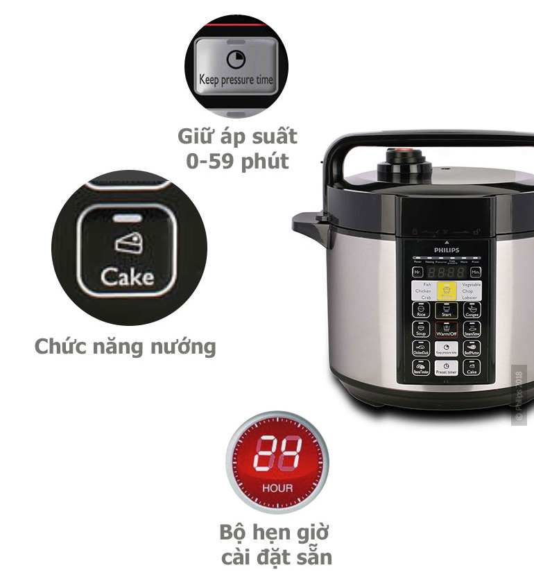 Nồi áp suất được tích hợp đến 14 chế độ nấu nướng tự động, có thể nấu được thịt, hầm gân, nấu cháo, súp, cơm, nấu các loại thịt bò, cừu, gà, vịt, cá hay cua, còn có thể nướng bánh, nấu các loại rau củ và đậu nữa. Ngoài ra, nồi còn có chức năng giữ ấm đến 12 tiếng giúp bữa ăn gia đình luôn nóng và ngon.