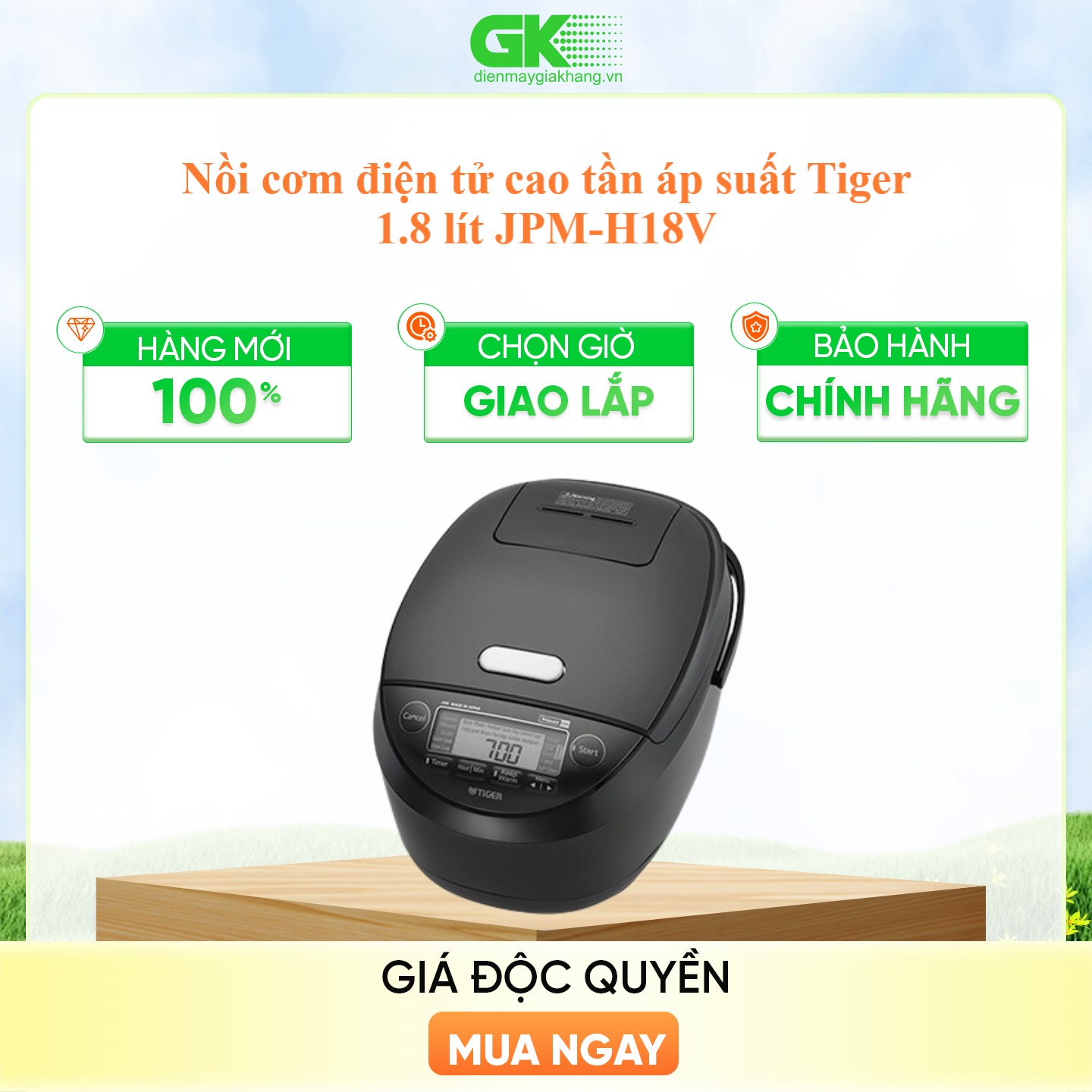 Nồi cơm điện tử cao tần áp suất hiệu Tiger JPM-H18V 5 trong 1 với 20 chế độ nấu và chế độ tự vệ sinh nồi “Self Clean“, lồng 3 lớp kim loại được phủ 3 lớp men gốm “Cordierite Ceramic” chống dính bằng tia hồng ngoại dầy 1.7mm, công nghệ từ tính (IH) và áp suất tự động 1.25ATM ở nhiệt độ 106ºC giúp hạt cơm ngọt hơn, thơm ngon hơn, dẻo hơn & tiết kiệm điện cùng với thiết kế 3 vòng nhiệt giúp cơm chín nhanh hơn mà hạt cơm không bị nát và không bị khô trong quá trình giữ ấm cơm, với công nghệ nấu cơm siêu tốc “Exp. Limited Cups” mới nhất được tích hợp để nấu chín 1 – 3 cốc gạo (2 – 6 chén cơm) trong vòng 17 – 26 phút khi bạn cần nấu thêm cơm nhanh hay bạn chỉ nấu cho một khẩu phần ăn, chế độ giữ ấm cơm đến 24h, 2 chế độ hẹn giờ nấu, chế độ ngâm gạo, có chức năng khóa nắp an toàn và báo không có lồng nồi, chức năng khử mùi, màn hình LCD điều chỉnh thông minh, có quai xách, cốc đong gạo, muỗng xới cơm tự đứng, muỗng múc cháo kèm theo sản phẩm, màu đen.
