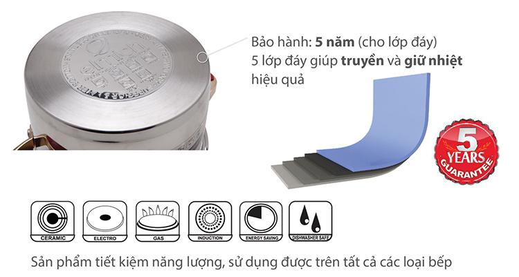 Đặc biệt sản phẩm có lớp đáy dày 5 lớp vô cùng hiện đại, giúp truyền và giữ nhiệt hiệu quả cũng như giúp bạn nấu nướng nhanh hơn, tiết kiệm được nhiều thời gian công sức hơn cũng như giúp lưu giữ hương thơm dài lâu và không bay hơi.