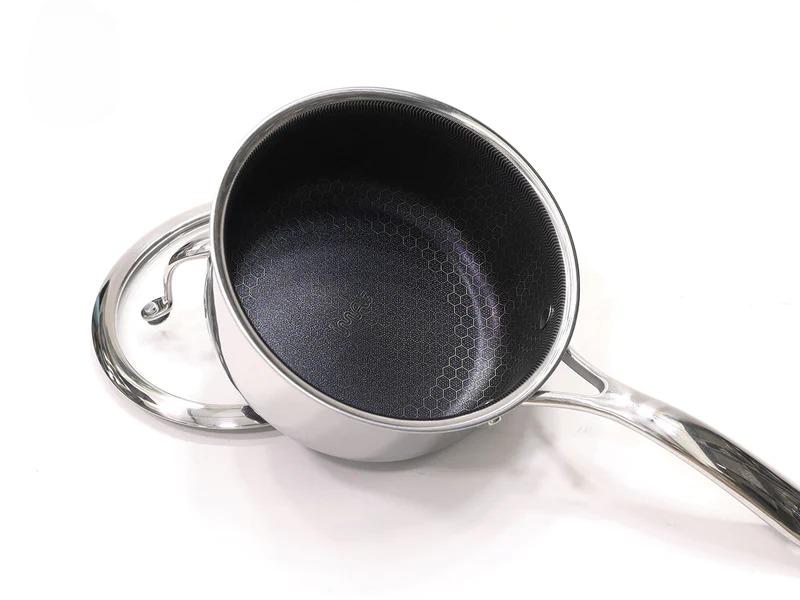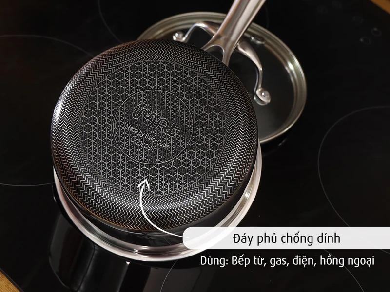 Quánh iMat Hybrid 16cm có vỏ ngoài là INOX 430 dày 0,5mm để bắt TỪ với bếp từ và tất cả các bếp thông thường, có phủ Blackcube chống dính; Lớp giữa dầy 2mm hoặc 1.2mm là NHÔM để dẫn và giữ nhiệt, lớp trong tiếp xúc với thực phẩm dày 0,5mm là INOX 304 được khoan khắc Blackcube bằng inox 304, tráng phủ chống dính Daikin Nhật Bản.