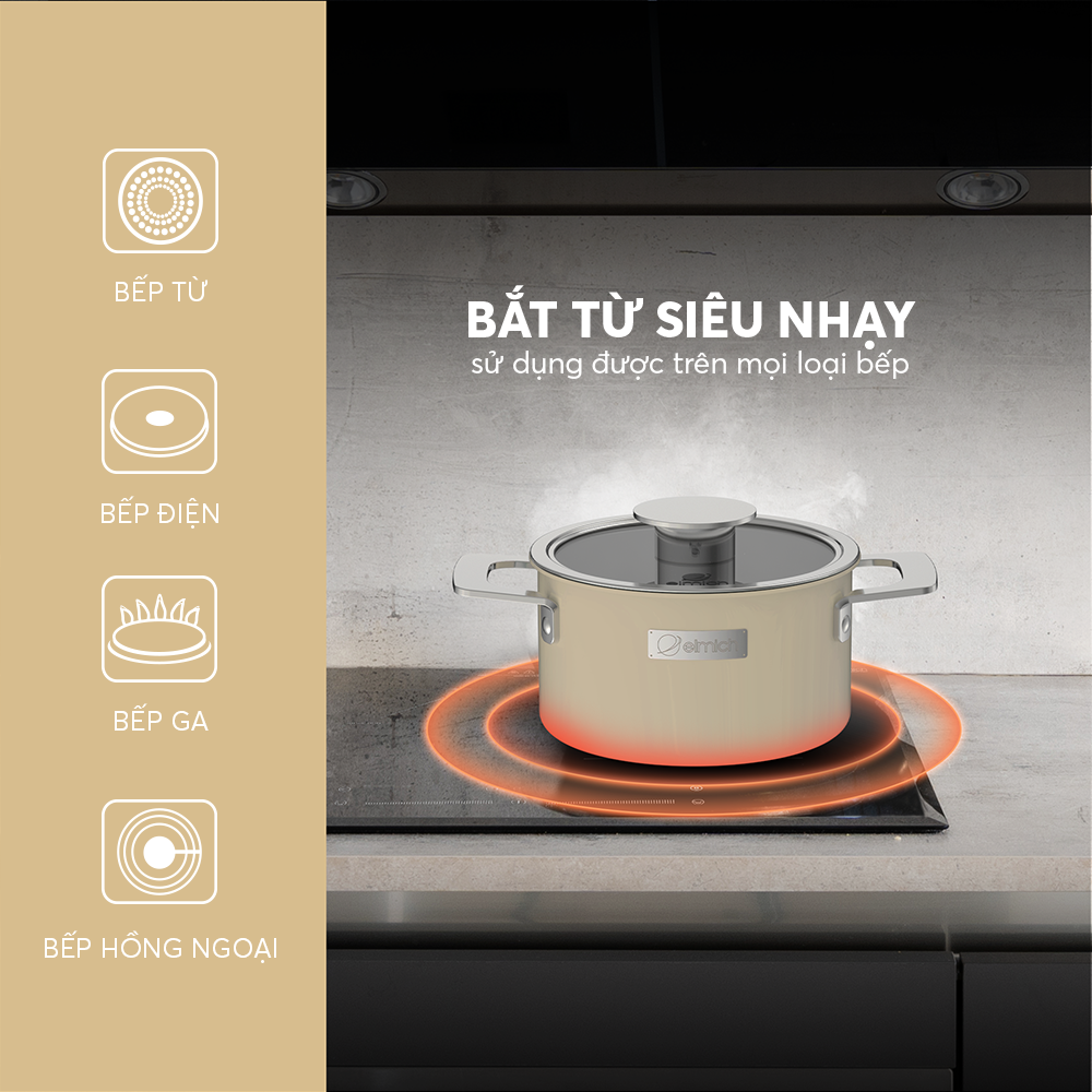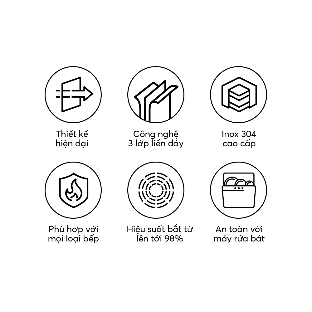 - Cấu tạo nguyên khối 3 lớp đáy liền thân giữ nhiệt tốt và truyền nhiệt nhanh, hiệu suất bắt từ cao giúp tiết kiệm năng lượng và thời gian.
