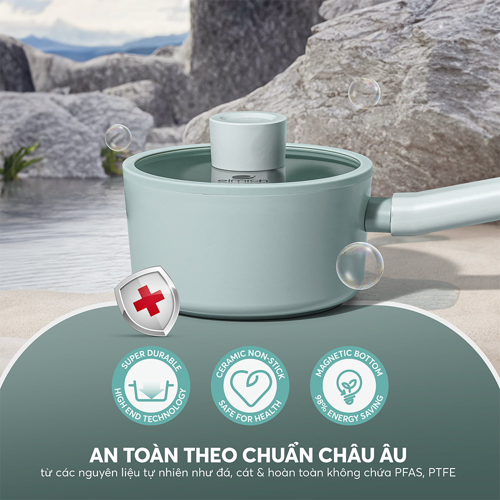 Được làm từ các nguyên liệu tự nhiên như đá, cát và sét thiên nhiên, đảm bảo an toàn tuyệt đối cho sức khỏe cũng như môi trường, hoàn toàn không chứa PFAS và PTFE gây hại.