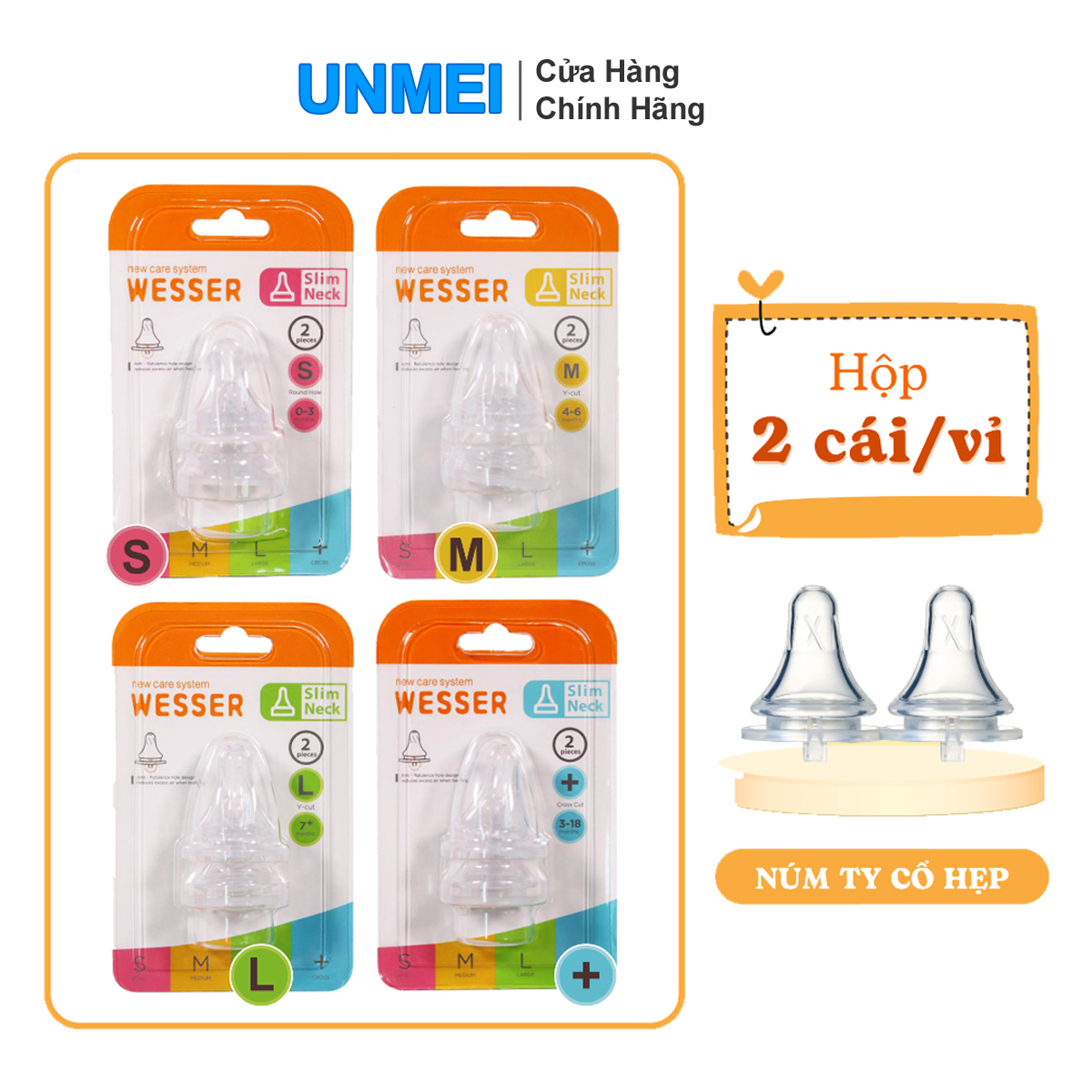 Núm ty cổ hẹp Wesser ngoài chất liệu silicone siêu mềm kết hợp với hệ thống lỗ kiểm soát sữa vừa đủ với từng giai đoạn phát triển của trẻ giúp vừa chống tắc, vừa chống sặc, vừa chống đầy hơi. Thiết kế núm ty phù hợp với bình cổ hẹp, có nhiều size để bạn lựa chọn phù hợp với bé.