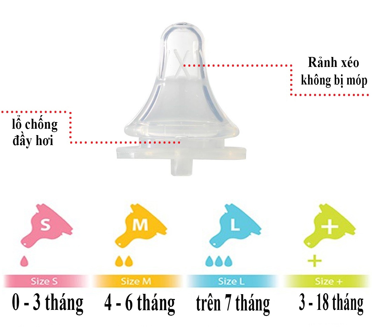 - Cấu tạo núm vú đặc biệt với hệ thống lỗ kiểm soát sữa vừa đủ với từng giai đoạn phát triển của trẻ giúp vừa chống tắc, vừa chống sặc, vừa chống đầy hơi.