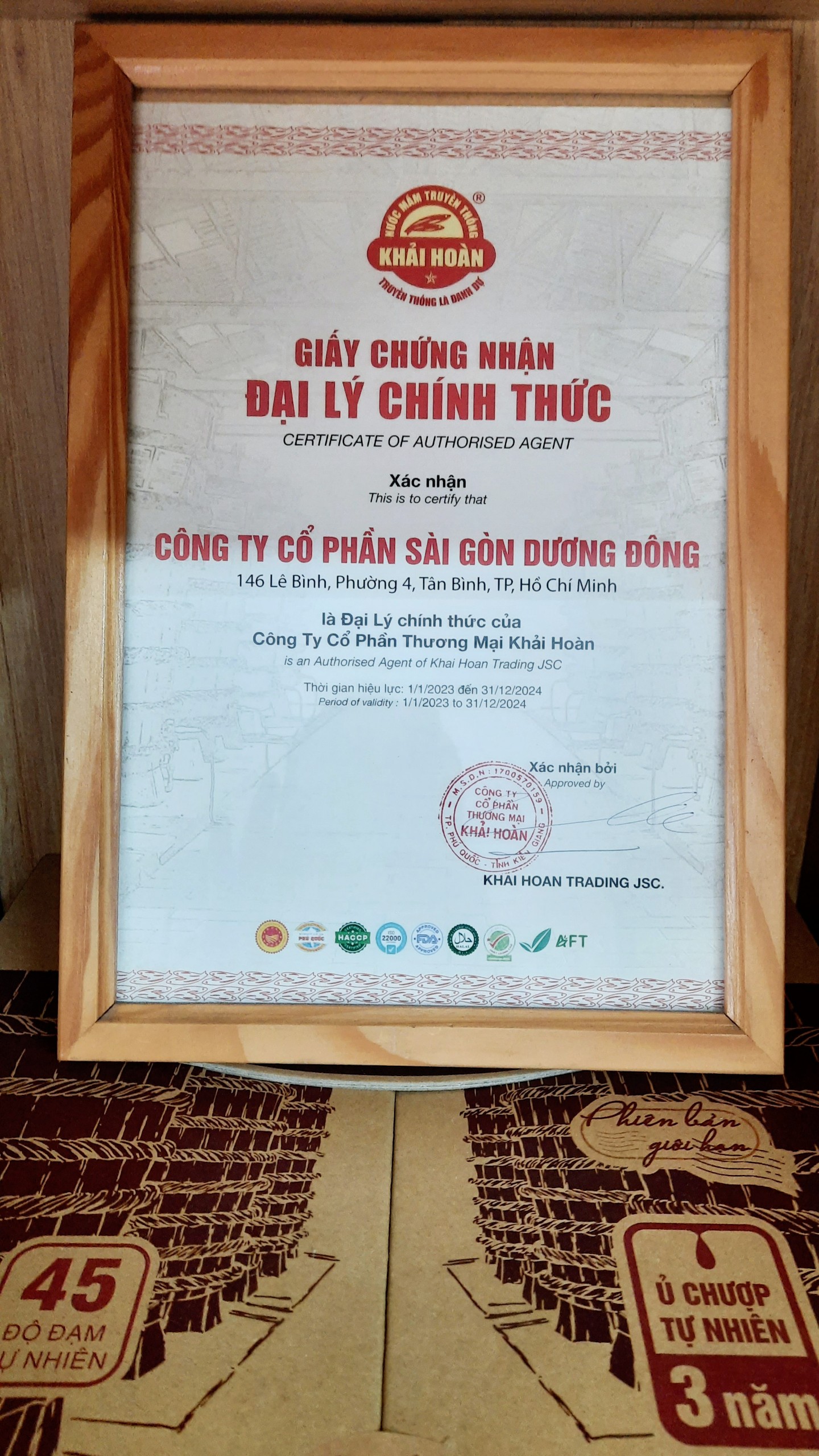 Thông tin sản phẩm Sản xuất và đóng chai tại: Đảo Phú Quốc, Kiên Giang, Việt Nam. Cơ sở sản xuất và chế biến: công ty cổ phần thương mại Khải Hoàn. Thành phần: 100% nước mắm cốt cá cơm, không phụ gia, không chất bảo quản. Thể tích thực: 1000ml Hàm lượng nitơ tổng số: 43g/l Hàm lượng nitơ axit amin: >50% TCBSP: 01/KH/2019 Hướng dẫn sử dụng: Dùng làm nước chấm hoặc gia vị. Hướng dẫn bảo quản: Sản phẩm phải được bảo quản nơi sạch sẽ, tránh ánh nắng trực tiếp, đậy nắp kín sau khi sử dụng. NSX theo lô- HSD: Sử dụng tốt nhất trước 24 tháng kể từ ngày sản xuất. Bao bì: chai nhựa, 1 chai CHÚ Ý: Trong quá trình bảo quản, sử dụng sản phẩm có thể xảy ra hiện tượng kết tinh muối và chuyển đổi màu từ nâu vàng đến nâu đậm. Đó là hiện tượng tự nhiên của nước mắm truyền thống. - Sản xuất và đóng chai tại: Đảo Phú Quốc, Kiên Giang, Việt Nam. - Cơ sở sản xuất và chế biến: công ty cổ phần thương mại Khải Hoàn. - Thành phần: 100% nước mắm cốt cá cơm, không phụ gia, không chất bảo quản. - Thể tích thực: 1000ml - Hàm lượng nitơ tổng số: 43g/l - Hàm lượng nitơ axit amin: >50% - TCBSP: 01/KH/2019 - Hướng dẫn sử dụng: Dùng làm nước chấm hoặc gia vị. - Hướng dẫn bảo quản: Sản phẩm phải được bảo quản nơi sạch sẽ, tránh ánh nắng trực tiếp, đậy nắp kín sau khi sử dụng. - NSX theo lô- HSD: Sử dụng tốt nhất trước 24 tháng kể từ ngày sản xuất. - Bao bì: chai nhựa, 1 chai CHÚ Ý: Trong quá trình bảo quản, sử dụng sản phẩm có thể xảy ra hiện tượng kết tinh muối và chuyển đổi màu từ nâu vàng đến nâu đậm. Đó là hiện tượng tự nhiên của nước mắm truyền thống. Bao bì sản phẩm có thể thay đổi tùy theo từng lô hàng