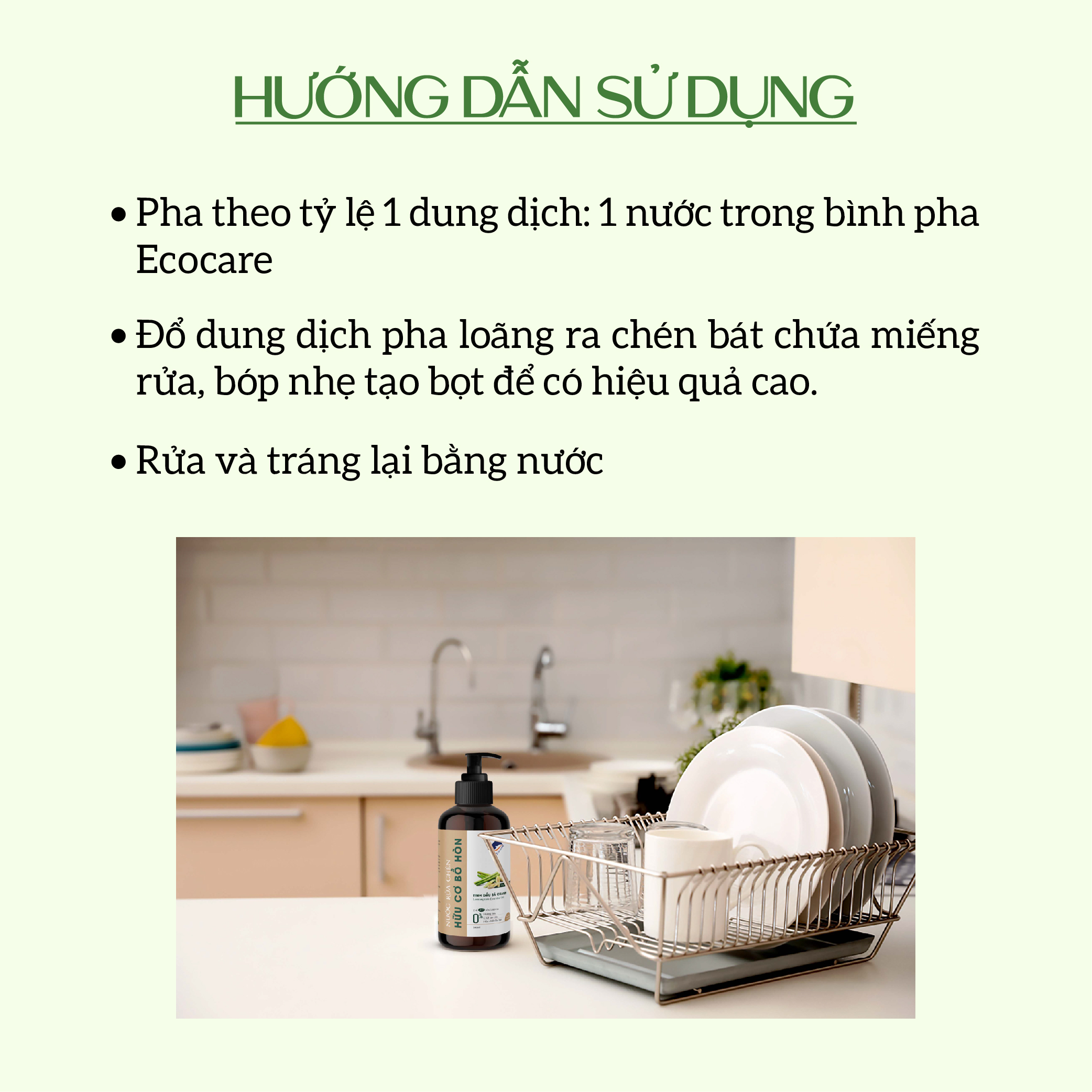 - Pha theo tỷ lệ 1 dung dịch: 1 nước trong bình pha Ecocare
