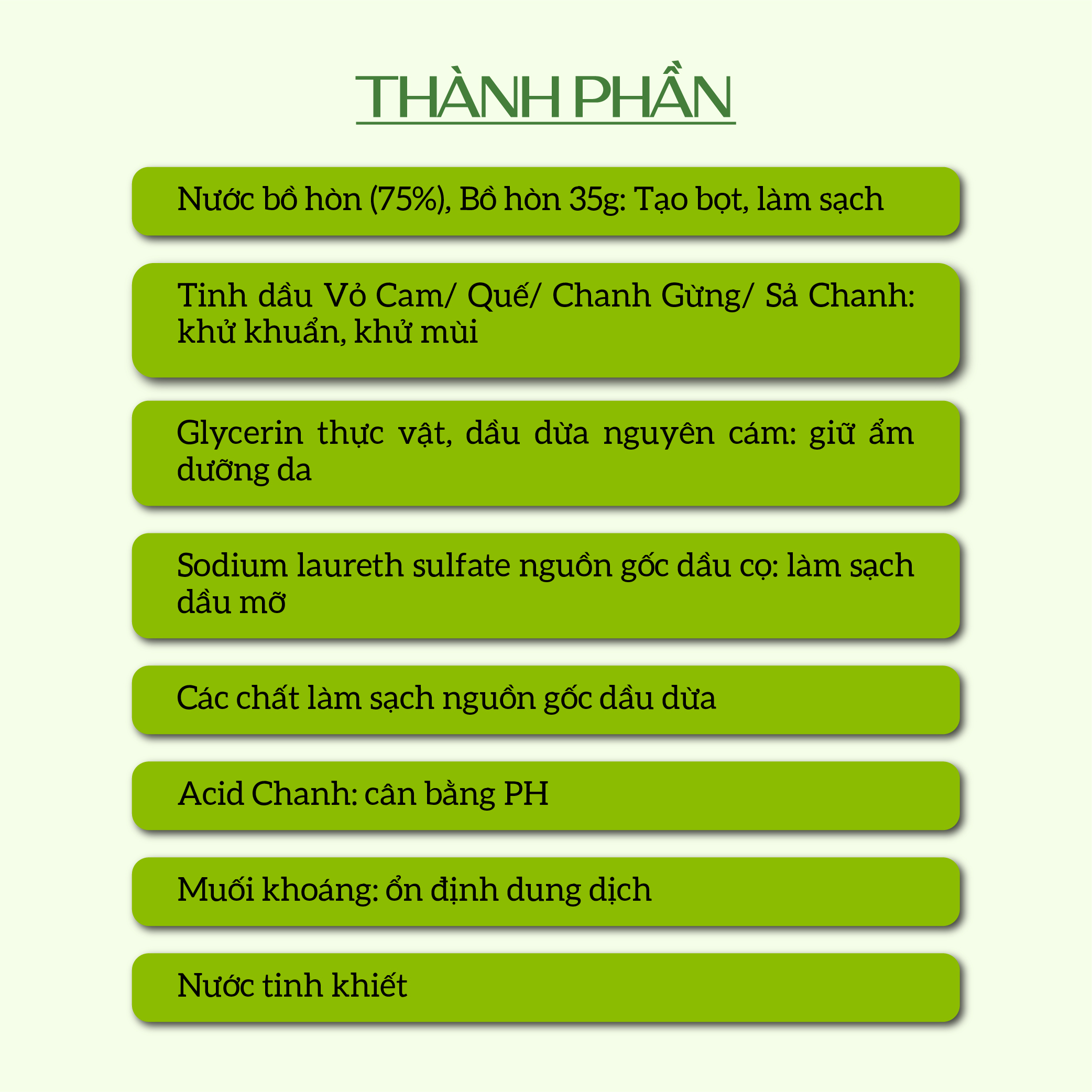 - Glycerin thực vật, dầu dừa nguyên cám (giữ ẩm dưỡng da).