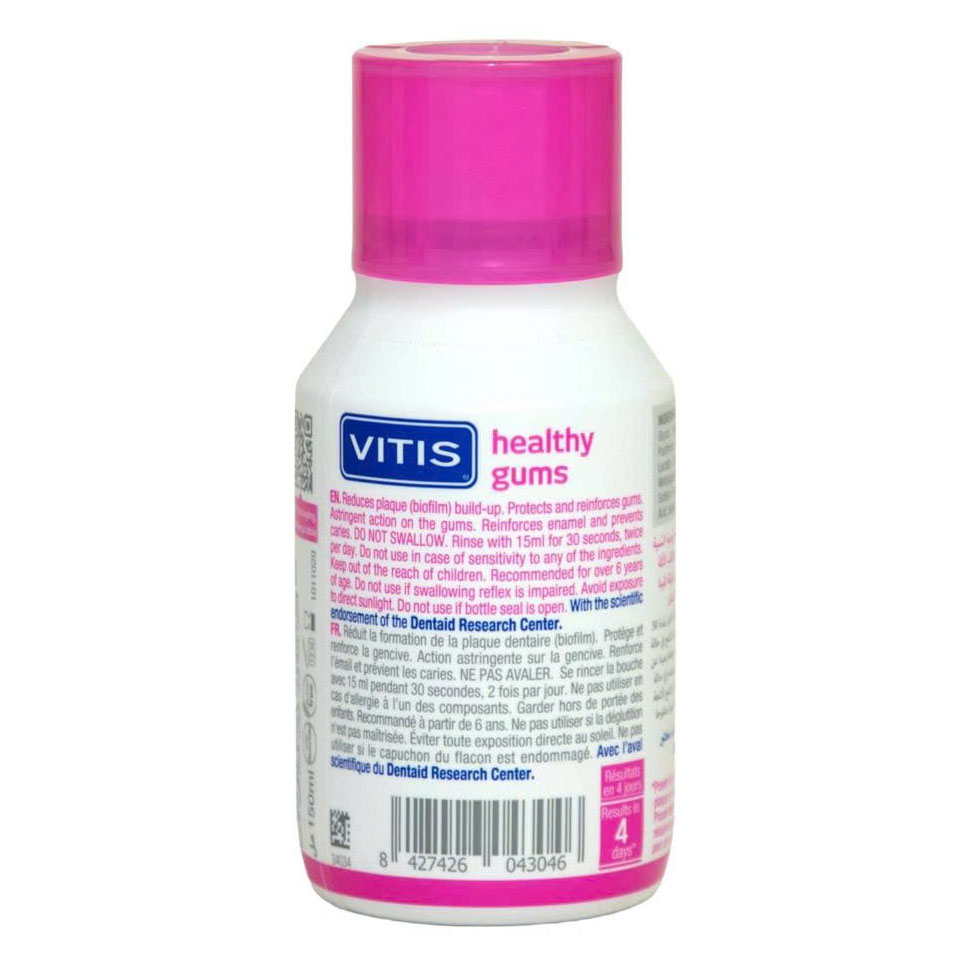 Nước súc miệng Vitis Healthy Gumcung cấp sự bảo vệ nâng cao cho người có nguy cơ mắc bệnh viêm nướu, chăm sóc nướu răng hằng ngày giúp làm giảm các triệu chứng sưng viêm và chảy máu chân răng. Người có nguy cơ cao mắc phải vấn đề về nướu như: tim mạch, tiểu đường, biến chứng trong thai kỳ, viêm đường hô hấp, viêm khớp dạng thấp, Celiac. Nước súc miệng không chứa cồn và không chứa màu nhân tạo.