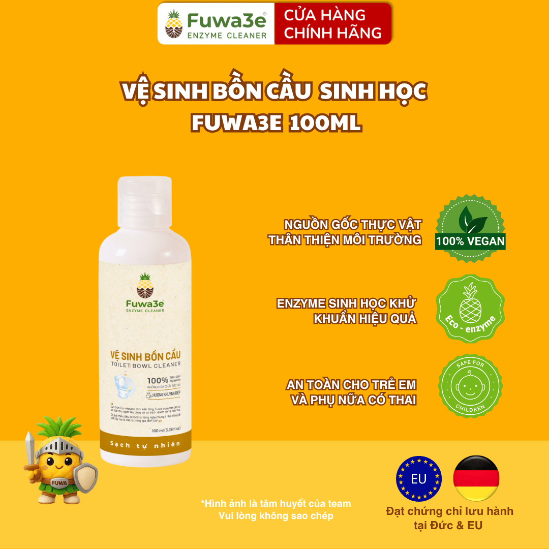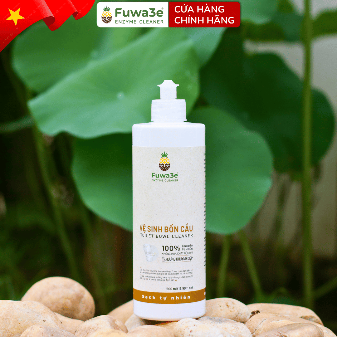 Nước tẩy bồn cầu nhà tắm Fuwa3e ứng dụng công nghệ enzyme sinh học lên men từ dứa và bồ hòn, giúp làm sạch cáu cặn bẩn và khử mùi hôi hiệu quả. Sản phẩm không chứa hóa chất độc hại, an toàn cho da ngay cả khi không dùng găng tay và không mùi độc hại.