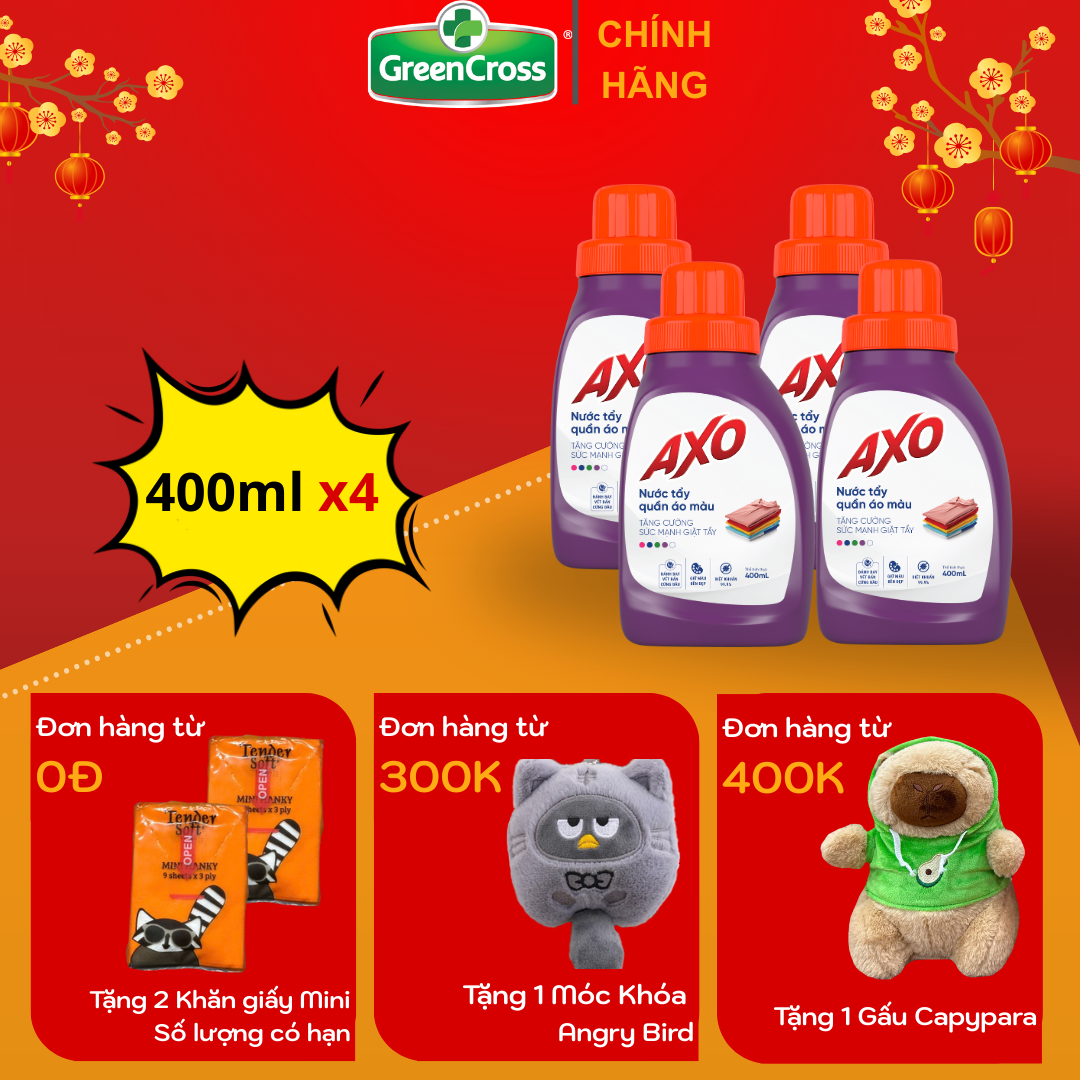 Thông số kỹ thuật Combo 4 chai Nước tẩy đánh bay vết bẩn cứng đầu cho quần áo màu AXO 400ml