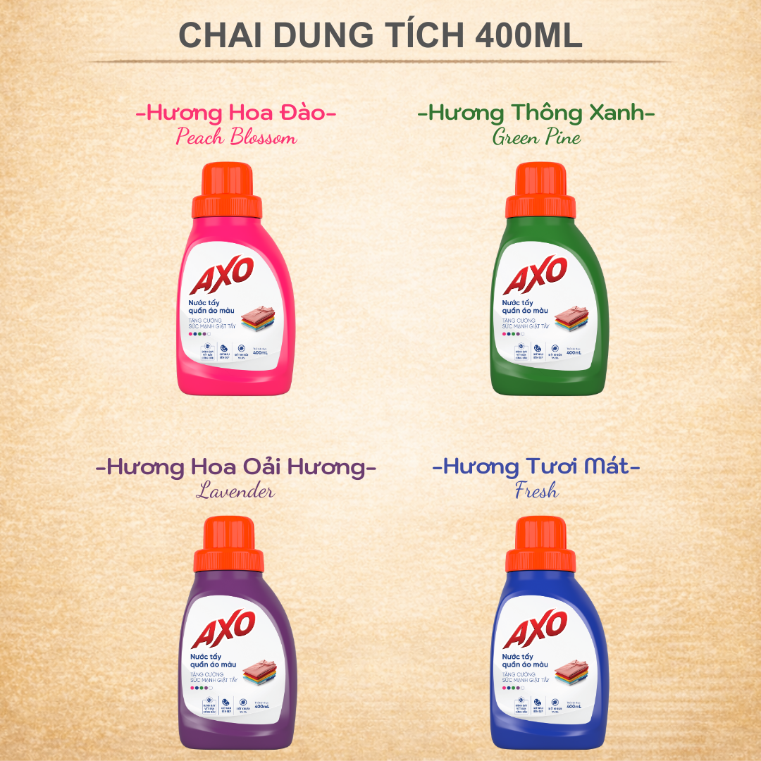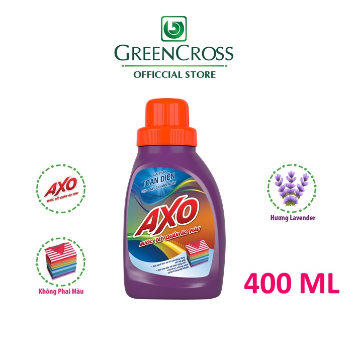 - Với công nghệ từ Philippines, AXO giúp tẩy sạch các vết bẩn trên quần áo màu như Cafe, Cari, dầu nhớt, vết mực, vết bút bi mà không làm bay màu quần áo.