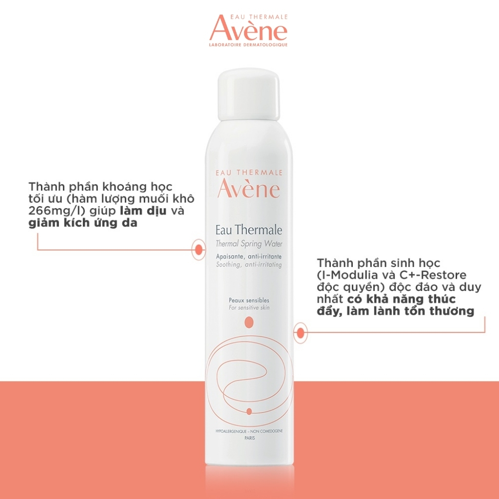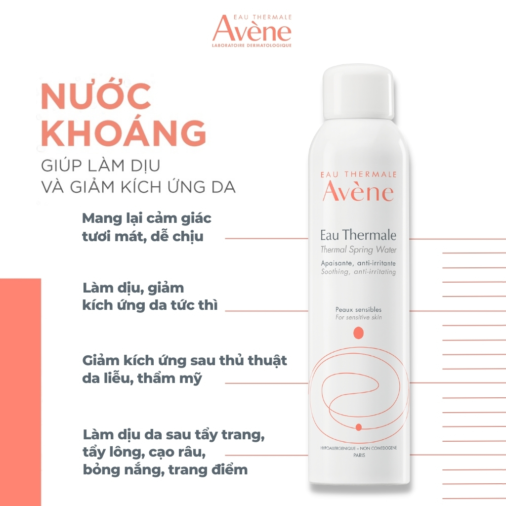 Nước khoáng Avène làm dịu, giảm kích ứng Avène Thermal Spring Water được đóng chai trực tiếp tại nguồn, trong điều kiện vô trùng, bảo toàn mọi đặc tính làm dịu da. Sản phẩm dạng phun sương cung cấp nước làm dịu da, chăm sóc và dưỡng ẩm cho da, giúp da của bạn luôn mềm mịn tự nhiên. Nước khoáng Avène có hơn 150 nghiên cứu lâm sàng và báo cáo khoa học về an toàn và hiệu quả trong chăm sóc da.