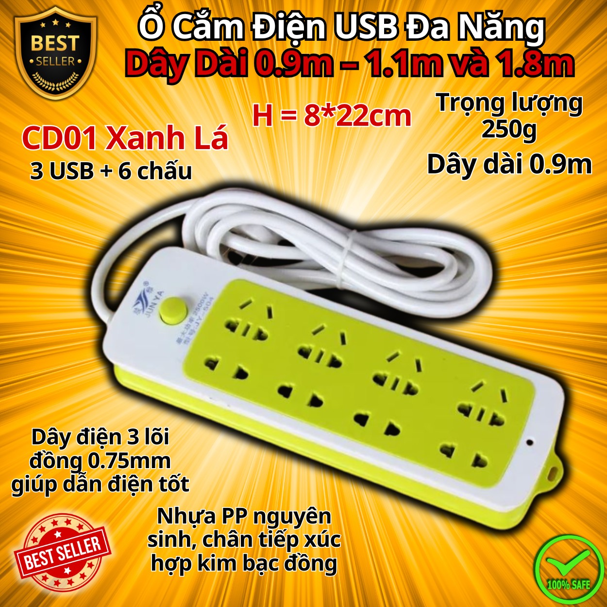 Ổ cắm tốt - nhựa dày và chắc - bền chứ ko giòn như mấy ổ cắm mua bên ngoài - dây đồng dày,dây cắm dài 2m nên khá thoải mái. ổ dài 3 ngăn, 4 cái lỗ cắm usb ok - sạc điện thoại được. nói chung khá hài lòng, dùng chưa biết bền đến bao giờ, nhưng như này nhận hàng thì ưng rồi!!