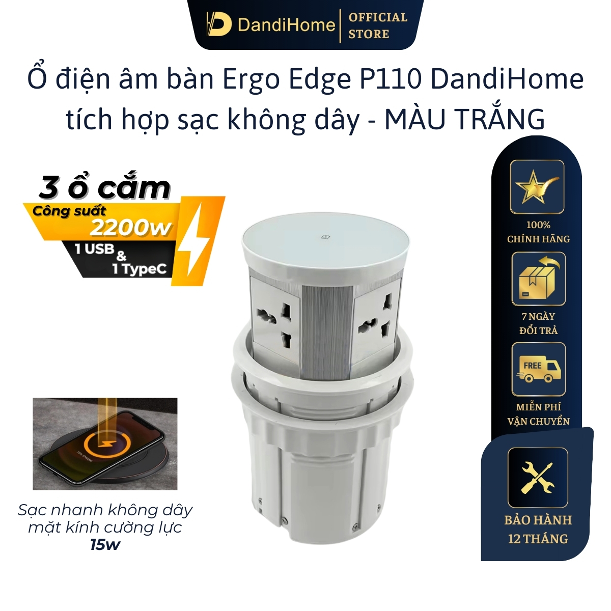 - Ổ điện âm bàn ERGO EDGE P110 tích hợp sạc không dây 15w: 2 màu trắng và đen