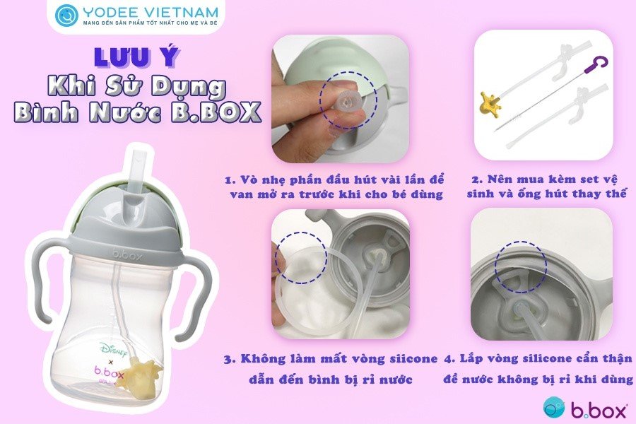 - Ống hút silicone siêu mềm có van chống sặc vừa giúp bé dễ điều chỉnh lượng nước hút lên vừa chống rò rỉ nước ngay cả khi bé dốc ngược bình.