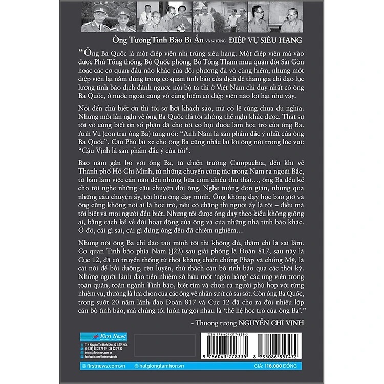 Với mong muốn tôn vinh người anh hùng thầm lặng và để nhiều người hiểu thêm về những chiến công hiển hách cũng như những hy sinh thầm lặng của lực lượng tình báo Việt Nam, Thượng tướng Nguyễn Chí Vịnh đã đề nghị hai nhà báo Hoàng Hải Vân và Tấn Tú tập hợp và biên soạn các bài báo, kèm theo một số thông tin mới cùng những suy ngẫm của họ qua 20 năm nhìn lại. Cuốn sách “Ông tướng tình báo bí ẩn và những điệp vụ siêu hạng” tập hợp loạt ký sự dài 36 kỳ được đăng trên báo Thanh Niên vào năm 2004, đồng thời bổ sung một phần về hoạt động của ông Ba Quốc sau năm 1975 – với những chiến công mà các tác giả phải thừa nhận là “lừng lẫy” hơn những gì họ có thể tưởng tượng.