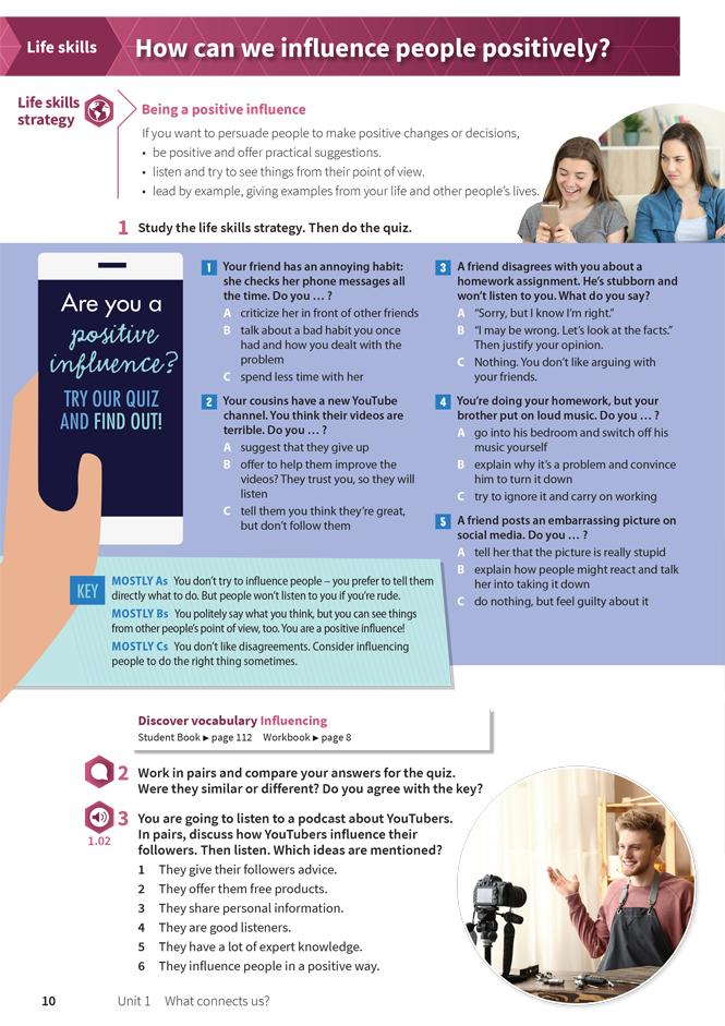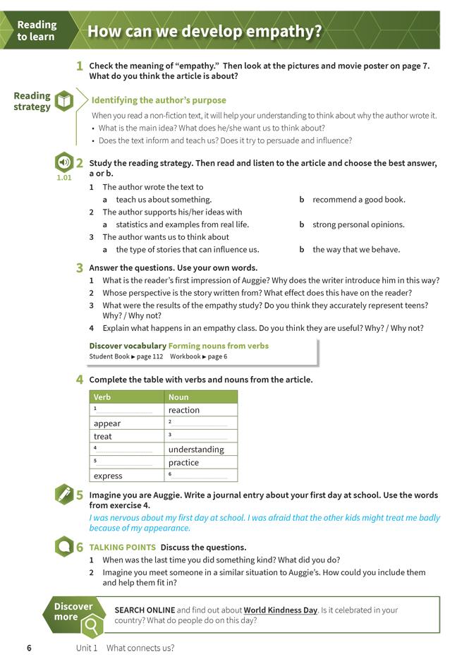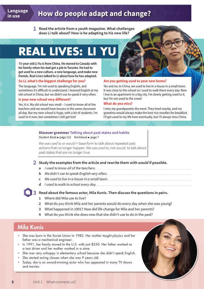The Student Book is packed full of interesting and thought-provoking content to keep students of all abilities fully engaged and motivated. Each unit presents students with a unit question, and five lesson questions, encouraging students to examine the world more critically within an inquiry-based learning environment. The Student Book also includes Vocabulary and Grammar reference and practice, Project lessons, Literature lessons, and a Writing workshop.