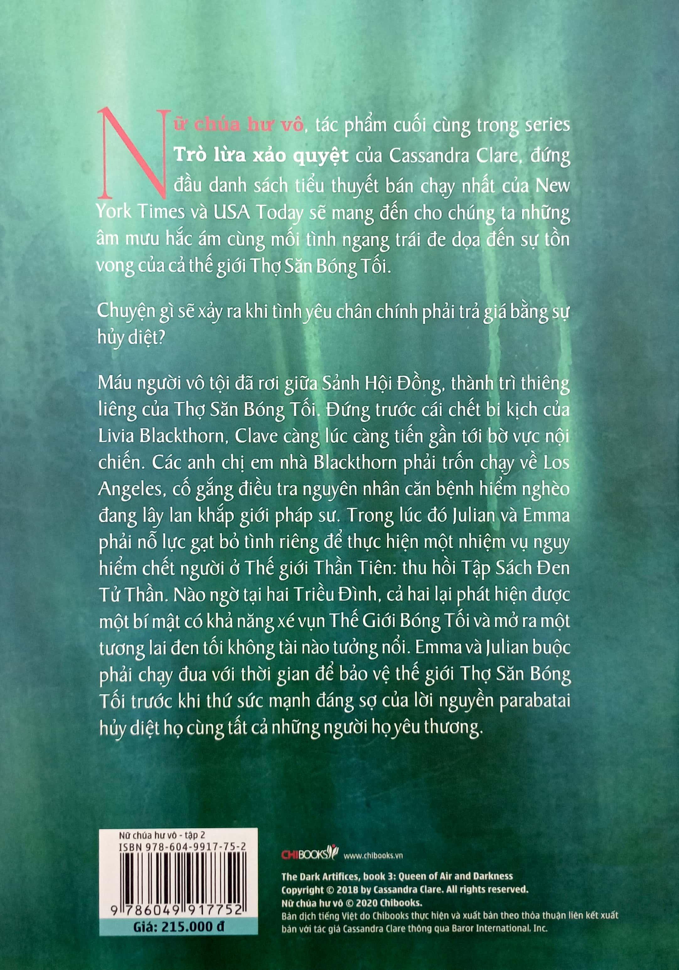 Nữ Chúa Hư Vô, tác phẩm cuối cùng trong series Trò Lừa Xảo Quyệt của Cassandra Clare, đứng đầu danh sách tiểu thuyết bán chạy nhất của New York Times và USA Today sẽ mang đến cho chúng ta những âm mưu hắc ám cùng mối tình ngang trái đe dọa đến sự tồn vong của cả thế giới Thợ Săn Bóng Tối.