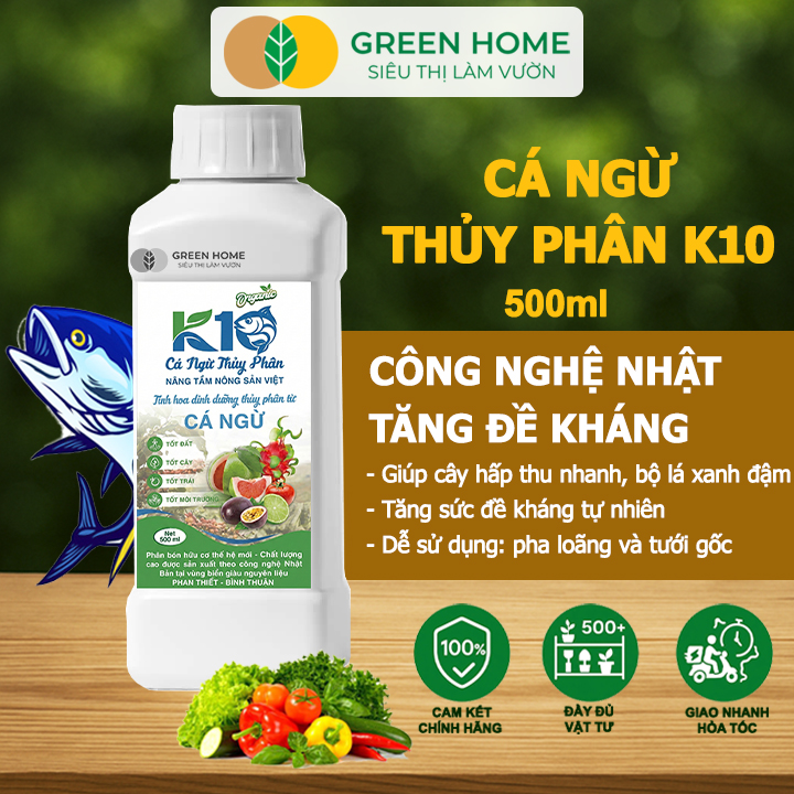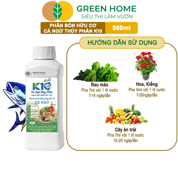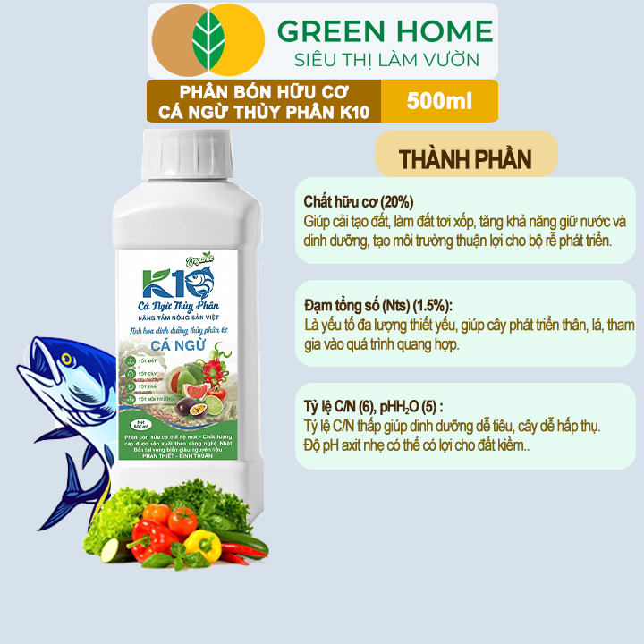 Thông số kỹ thuật Phân Đạm Cá Hữu Cơ Sinh Học GreenHome, Dịch Cá Biển Thủy Phân K10, Chai 500ml, Hàm Lượng Dinh Dưỡng Cao, Thế Hệ Mới, Công Nghệ Nhật Bản
